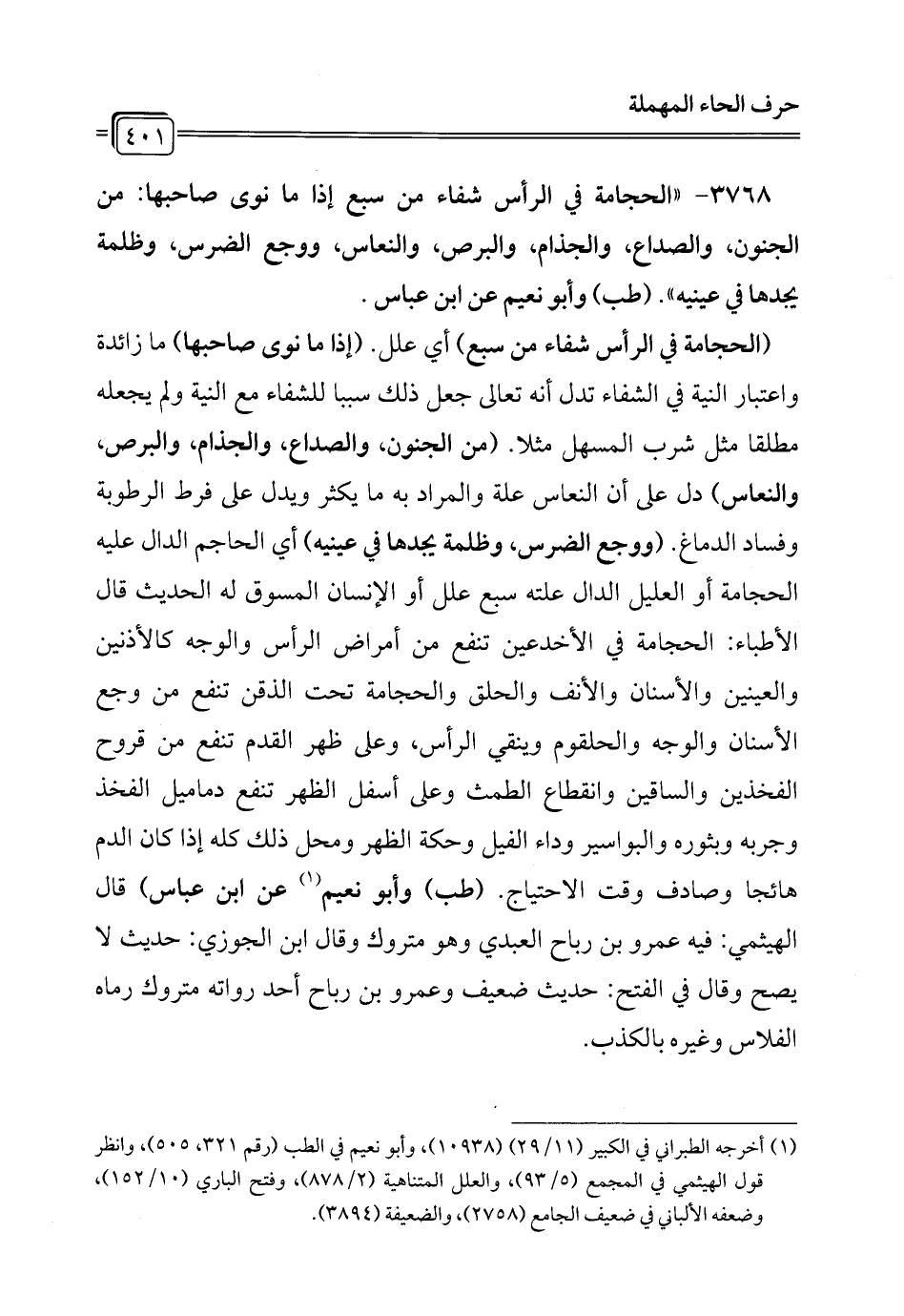3768 - "الحجامة في الرأس شفاء من سبع إذا ما نوى صاحبها: من الجنون، والصداع، والجذام، والبرص، والنعاس، ووجع الضرس، وظلمة يجدها في عينيه". (طب) وأبو نعيم عن ابن عباس.