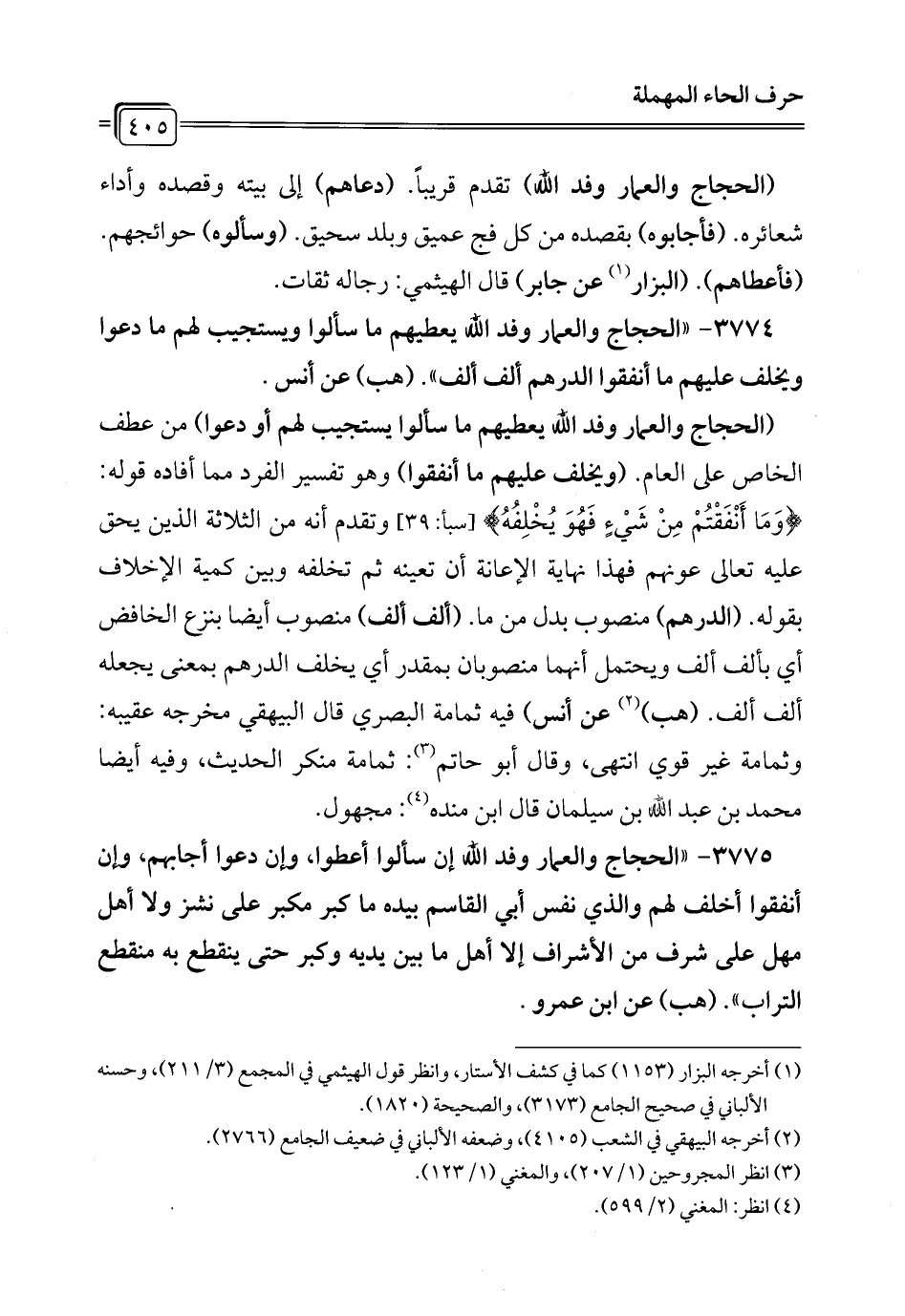 3774 - "الحجاج والعمار وفد الله يعطيهم ما سألوا ويستجيب لهم ما دعوا ويخلف عليهم ما أنفقوا الدرهم ألف ألف". (هب) عن أنس.