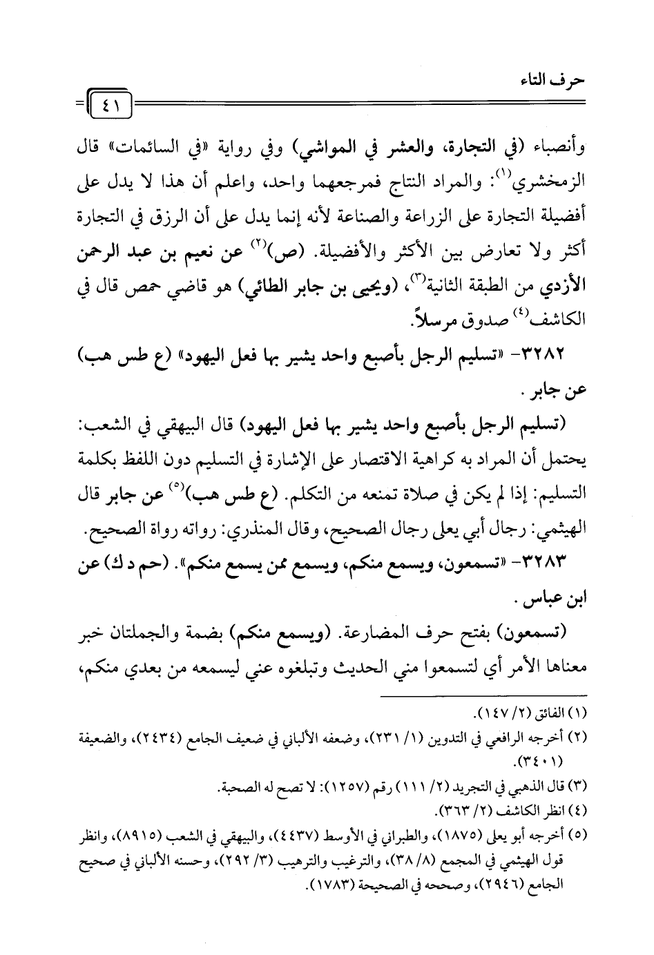(تسليم الرجل بأصبع واحد يشير بها فعل اليهود) قال البيهقي في الشعب: يحتمل أن المراد به كراهية الاقتصار على الإشارة في التسليم دون اللفظ بكلمة التسليم: إذا لم يكن في صلاة تمنعه من التكلم. (ع طس هب) (¬5) عن جابر قال الهيثمي: رجال أبي يعلى رجال الصحيح، وقال المنذري: رواته رواة الصحيح.