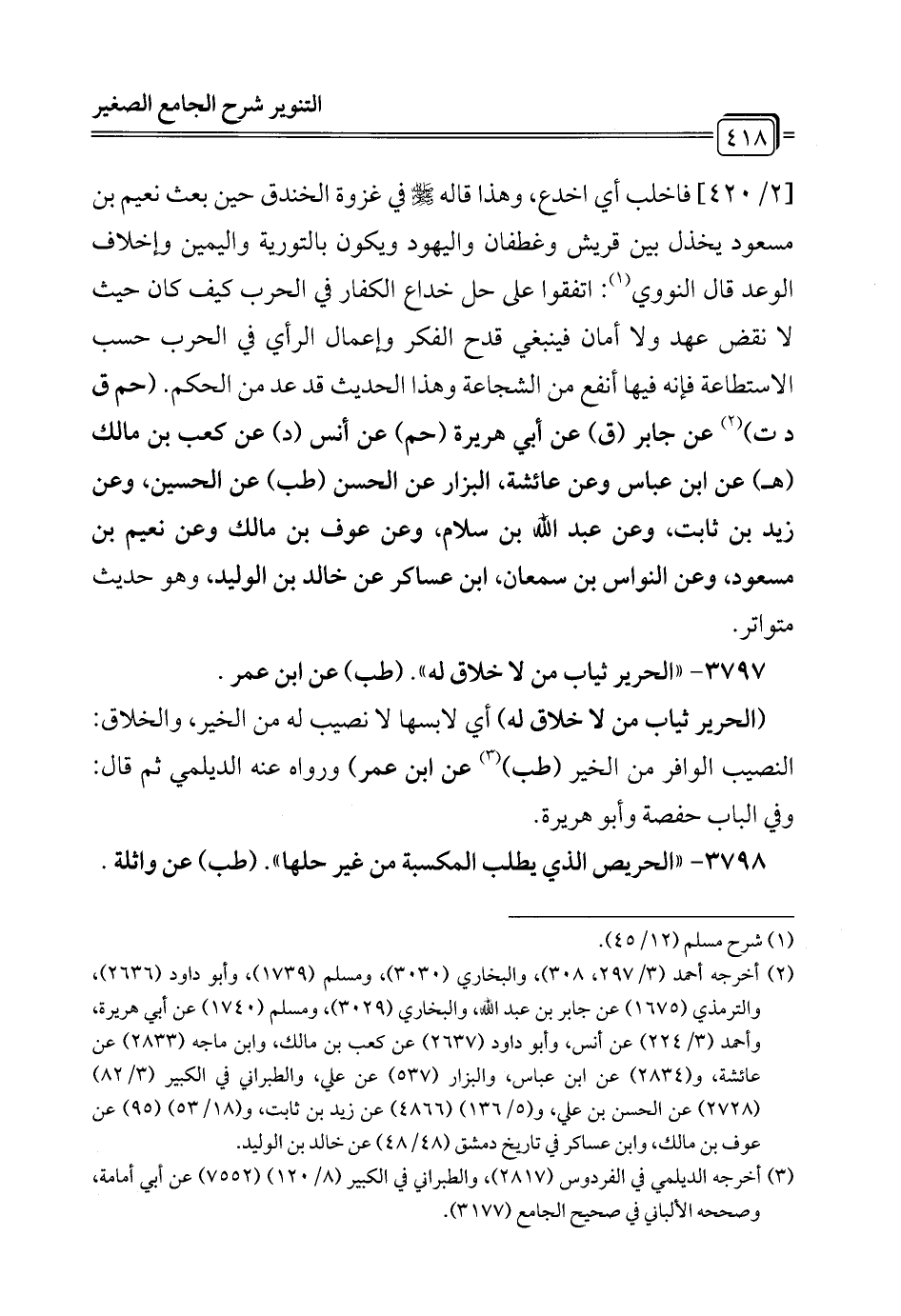 (¬2) أخرجه أحمد (3/ 297، 308)، والبخاري (3030)، ومسلم (1739)، وأبو داود (2636)، والترمذي (1675) عن جابر بن عبد الله، والبخاري (3029)، ومسلم (1740) عن أبي هريرة وأحمد (3/ 224) عن أنس، وأبو داود (2637) عن كعب بن مالك، وابن ماجه (2833) عن عائشة، و (2834) عن ابن عباس، والبزار (537) عن علي، والطبراني في الكبير (3/ 82) و (2728) عن الحسن بن علي، و (5/ 136) (4866) عن زيد بن ثابت، و (18/ 53) (95) عن عوف بن مالك، وابن عساكر في تاريخ دمشق (48/ 48) عن خالد بن الوليد.