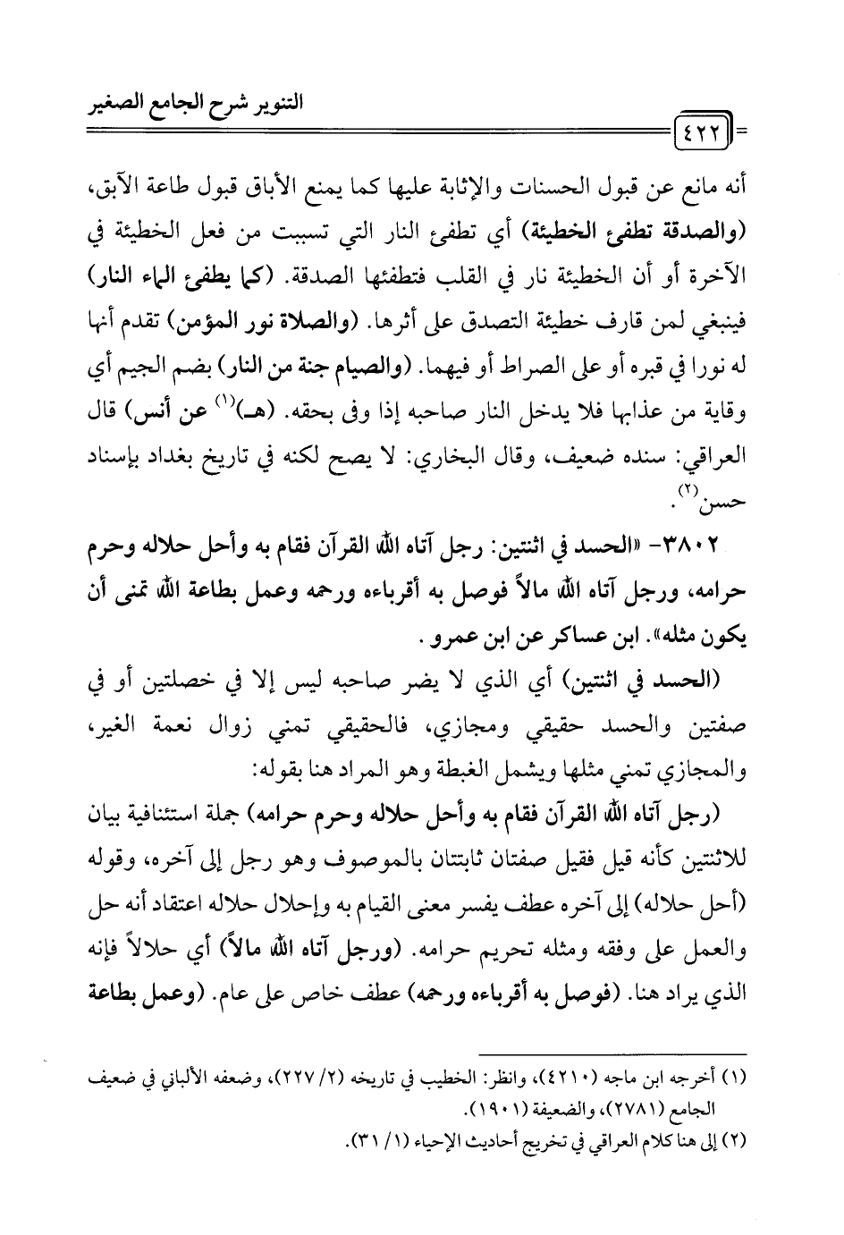 3802 - "الحسد في اثنتين: رجل آتاه الله القرآن فقام به وأحل حلاله وحرم حرامه، ورجل آتاه الله مالاً فوصل به أقرباءه ورحمه وعمل بطاعة الله تمنى أن يكون مثله". ابن عساكر عن ابن عمرو.