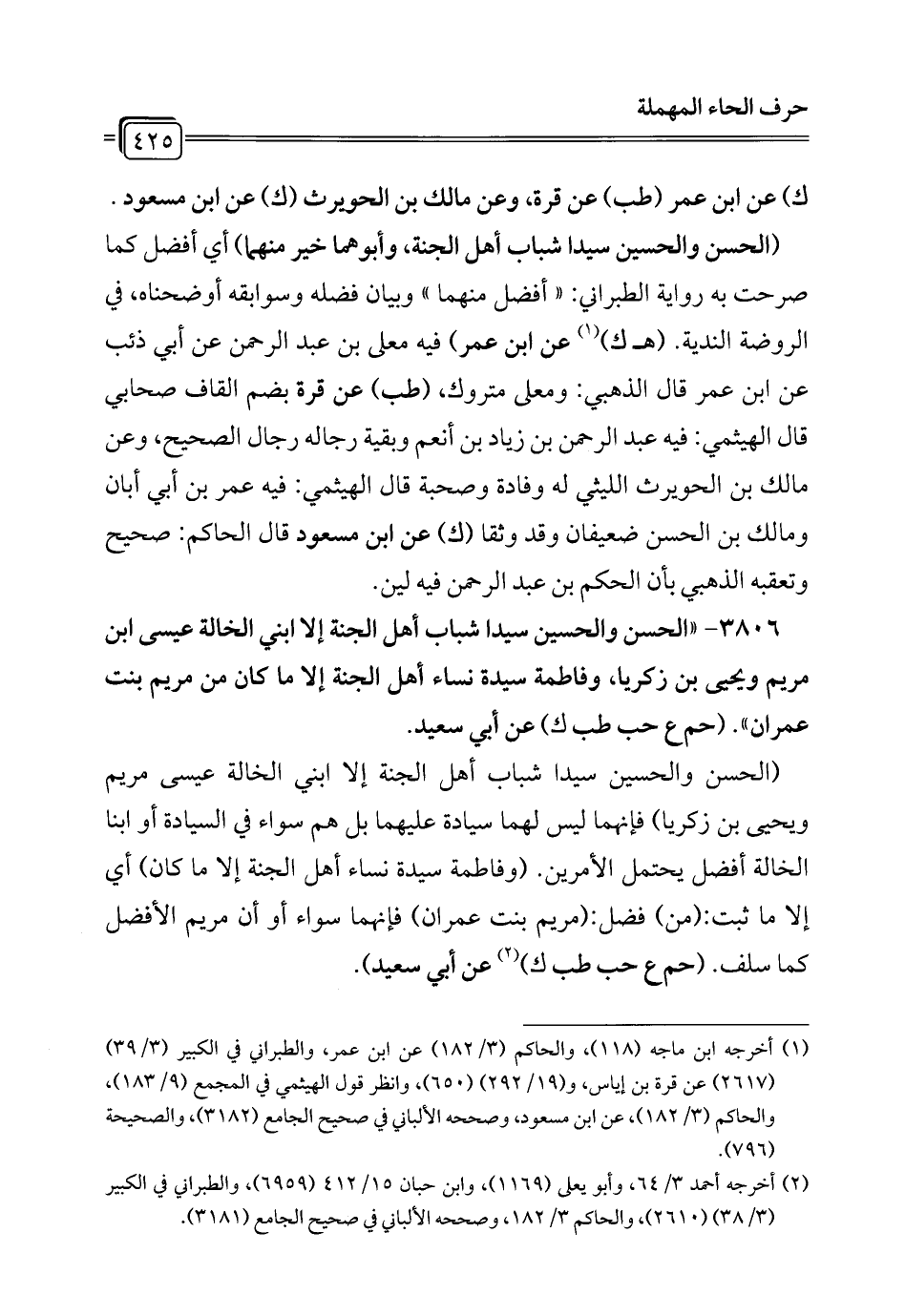 3806 - "الحسن والحسين سيدا شباب أهل الجنة إلا ابني الخالة عيسى ابن مريم ويحيى بن زكريا، وفاطمة سيدة نساء أهل الجنة إلا ما كان من مريم بنت عمران". (حم ع حب طب ك) عن أبي سعيد.