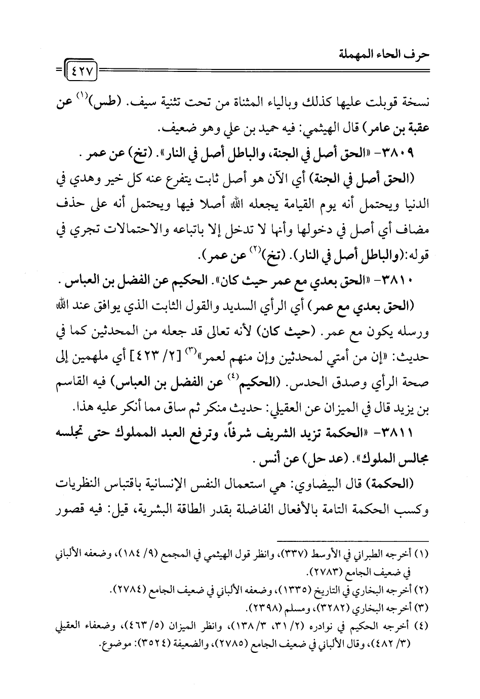 3809 - "الحق أصل في الجنة، والباطل أصل في النار". (تخ) عن عمر.