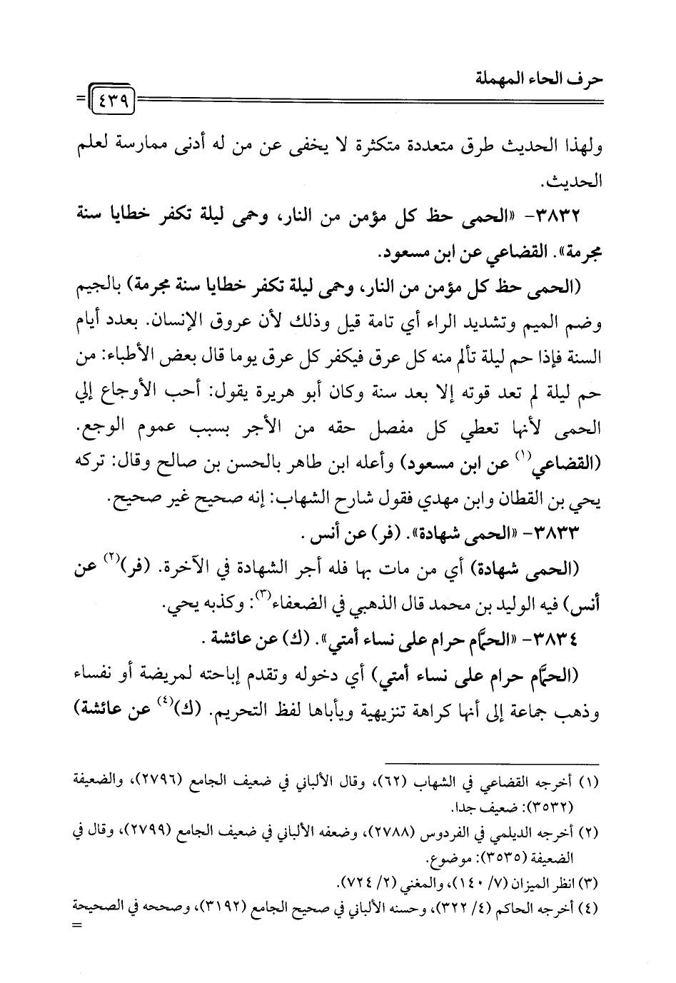 3832 - "الحمى حظ كل مؤمن من النار، وحمى ليلة تكفر خطايا سنة مجرمة". القضاعي عن ابن مسعود.