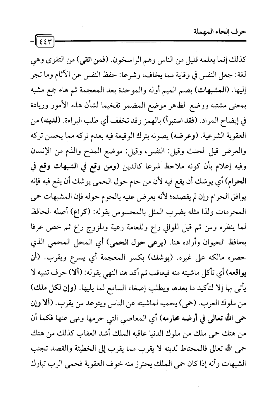 كذلك إنما يعلمه قليل من الناس وهم الراسخون. (فمن اتقى) من التقوى وهي لغة: جعل النفس في وقاية مما يخاف، وشرعا: حفظ النفس عن الآثام وما تجر إليها. (المشبهات) بضم الميم أوله والموحدة بعد المعجمة ثم هاء جمع مشبه بمعنى مشتبه ووضع الظاهر موضع المضمر تفخيما لشأن هذه الأمور وزيادة في إيضاح المراد. (فقد استبرأ) بالهمز وقد تخفف أي طلب البراءة. (لدينه) من العقوبة الشرعية. (وعرضه) يصونه بترك الوقيعة فيه بعدم تركه مما يحسن تركه والعرض قيل الحنث وقيل: النفس، وقيل: موضع المدح والذم من الإنسان وفيه إعلام بأن كونه ملاحظ شرعًا كالدين (ومن وقع في الشبهات وقع في الحرام) أي يوشك أن يقع فيه لأن من حام حول الحمى يوشك أن يقع فيه فإنه يوافق الحرام وإن لم يقصده؛ لأنه يعرض عليه بالحوم حوله فإن المشبهات حمى المحرمات ولذا مثله بضرب المثل بالمحسوس بقوله: (كراع) أصله الحافظ لما ينظره ومن ثم قيل للوالي راع وللعامة رعية وللزوج راع ثم خص عرفا بحافظ الحيوان وأراده هنا. (يرعى حول الحمى) أي المحل المحمي الذي حصره مالكه على غيره. (يوشك) بكسر المعجمة أي يسرع ويقرب. (أن يواقعه) أي تأكل ماشيته منه فيعاقب ثم أكد هنا النهي بقوله: (ألا) حرف تنبيه لا يأتى بها إلا لتأكيد ما بعدها ويطلب إصغاء السامع لما يليها. (وإن لكل ملك) من ملوك العرب. (حمى) يحميه لماشيته عن الناس ويتوعد من يقرب. (ألا وإن حمى الله تعالى في أرضه محارمه) أي المعاصي التي حرمها ونهى عنها فكما أن من هتك حمى ملك من ملوك الدنيا عاقبه الملك أشد العقاب كذلك من هتك حمى الله تعالى فالمحتاط لدينه لا يقرب مما يقرب إلى الخطيئة والقصد تجنب الشبهات وأنه إذا كان حمى الملك يحترز منه خوف العقوبة فحمى الرب تبارك