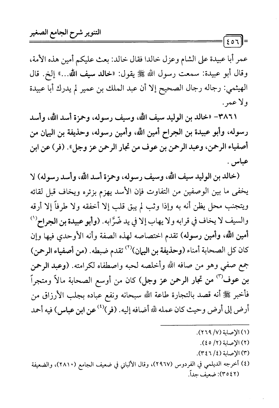 3861 - "خالد بن الوليد سيف الله، وسيف رسوله، وحمزة أسد الله، وأسد رسوله، وأبو عبيدة بن الجراح أمين الله، وأمين رسوله، وحذيفة بن اليمان من أصفياء الرحمن، وعبد الرحمن بن عوف من تجار الرحمن عَزَّ وَجَلَّ". (فر) عن ابن عباس.