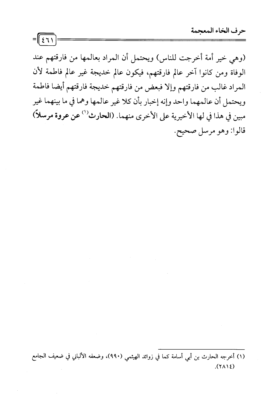 (وهي خير أمة أخرجت للناس) ويحتمل أن المراد بعالمها من فارقتهم عند الوفاة ومن كانوا آخر عالم فارقتهم، فيكون عالم خديجة غير عالم فاطمة لأن المراد غالب من فارقتهم وإلا فبعض من فارقتهم خديجة فارقتهم أيضاً فاطمة ويحتمل أن عالمهما واحد وإنه إخبار بأن كلا غير عالمها وهما في ما بينهما غير مبين في هذا في لها الأخيرية على الأخرى منهما. (الحارث (¬1) عن عروة مرسلاً) قالوا: وهو مرسل صحيح.