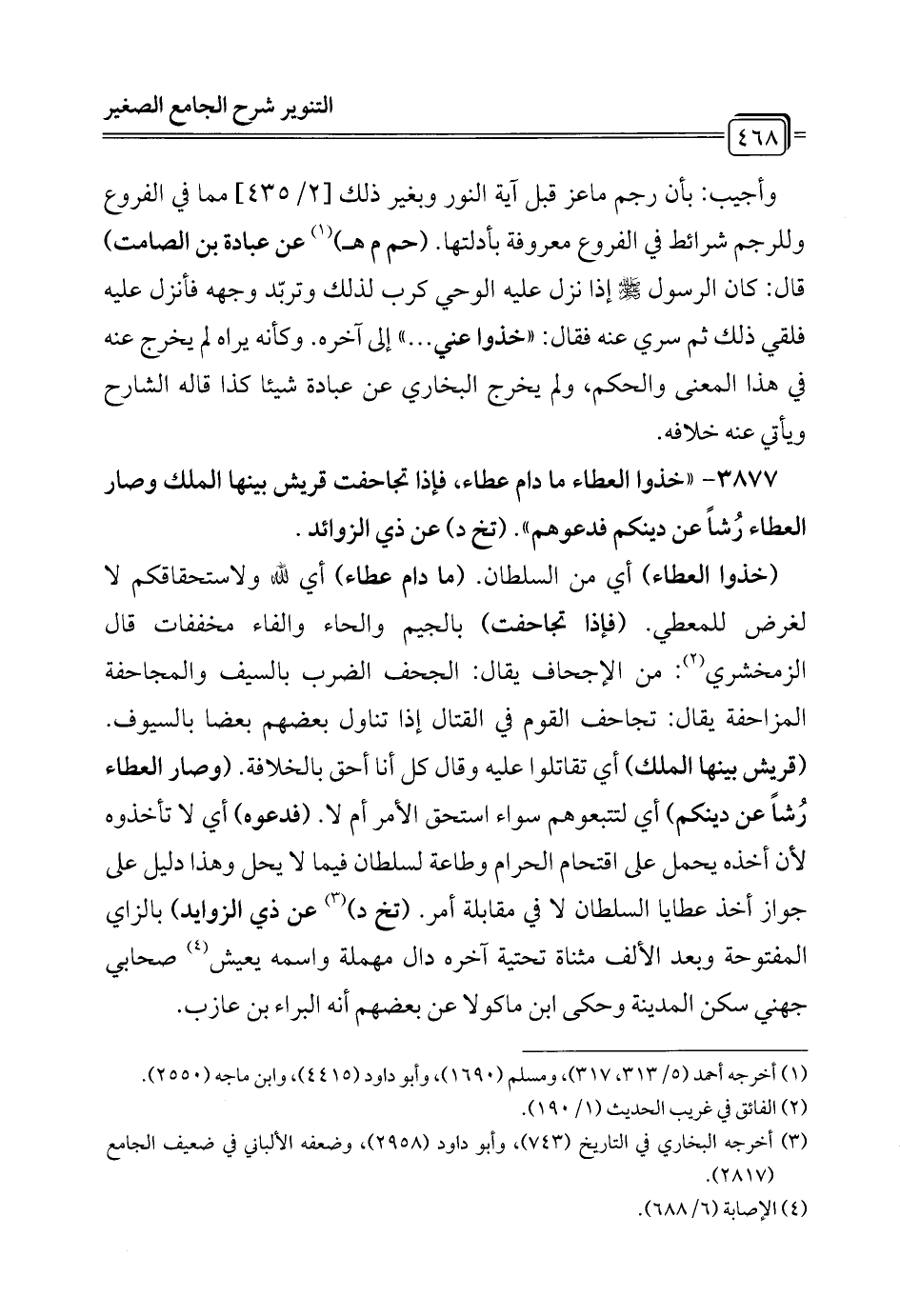 3877 - "خذوا العطاء ما دام عطاء، فإذا تجاحفت قريش بينها الملك وصار العطاء رُشاً عن دينكم فدعوهم". (تخ د) عن ذي الزوائد.