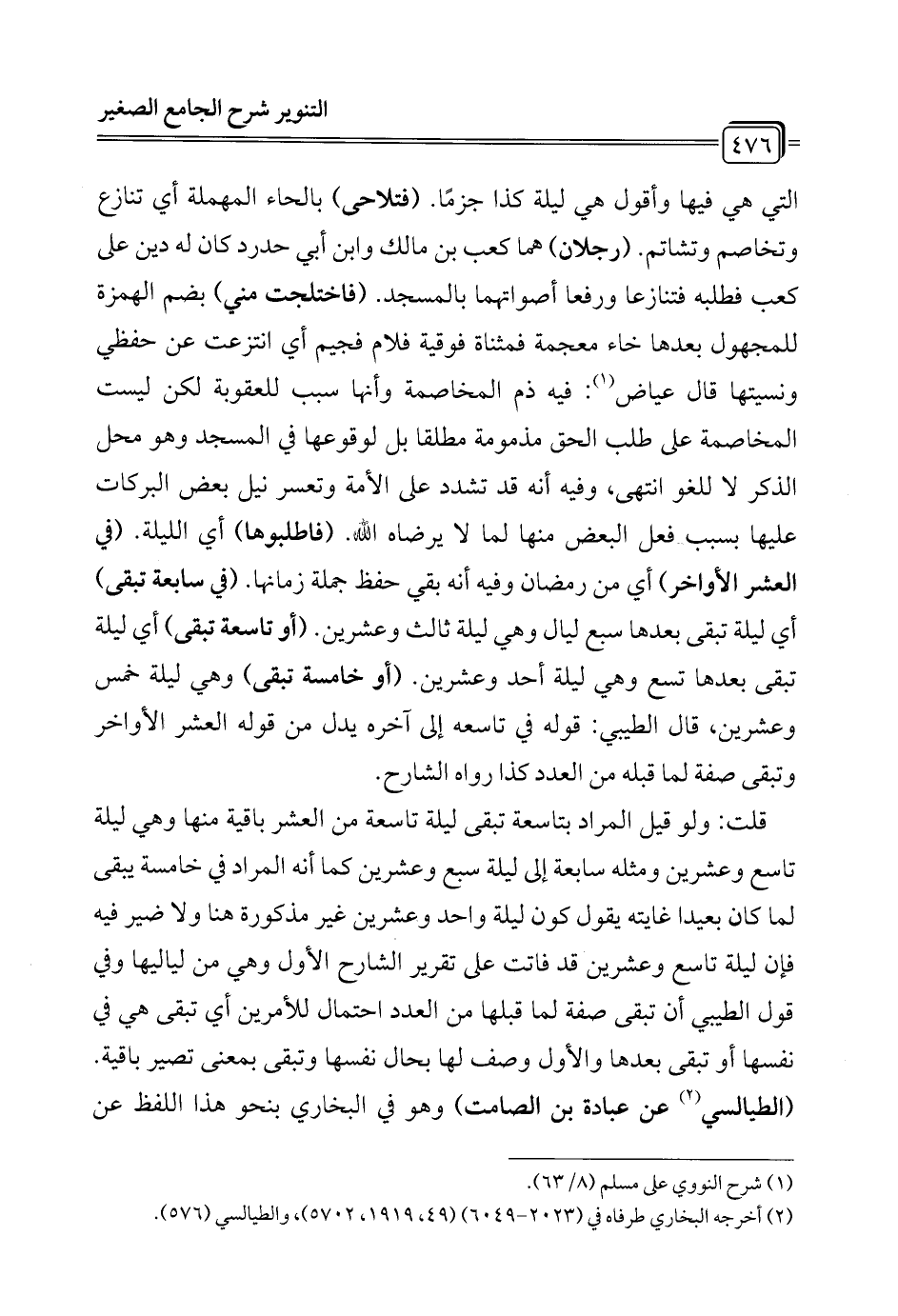 قلت: ولو قيل المراد بتاسعة تبقى ليلة تاسعة من العشر باقية منها وهي ليلة تاسع وعشرين ومثله سابعة إلى ليلة سبع وعشرين كما أنه المراد في خامسة يبقى لما كان بعيدا غايته يقول كون ليلة واحد وعشرين غير مذكورة هنا ولا ضير فيه فإن ليلة تاسع وعشرين قد فاتت على تقرير الشارح الأول وهي من لياليها وفي قول الطيبي أن تبقى صفة لما قبلها من العدد احتمال للأمرين أي تبقى هي في نفسها أو تبقى بعدها والأول وصف لها بحال نفسها وتبقى بمعنى تصير باقية. (الطيالسي (¬2) عن عبادة بن الصامت) وهو في البخاري بنحو هذا اللفظ عن