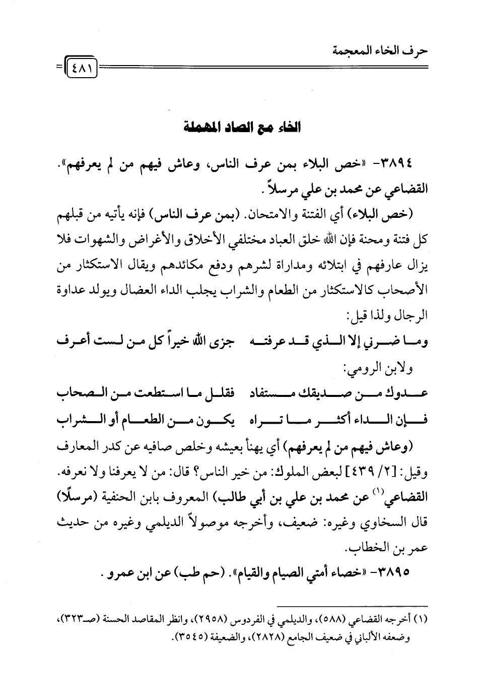 3894 - " خص البلاء بمن عرف الناس، وعاش فيهم من لم يعرفهم". القضاعي عن محمَّد بن علي مرسلاً.