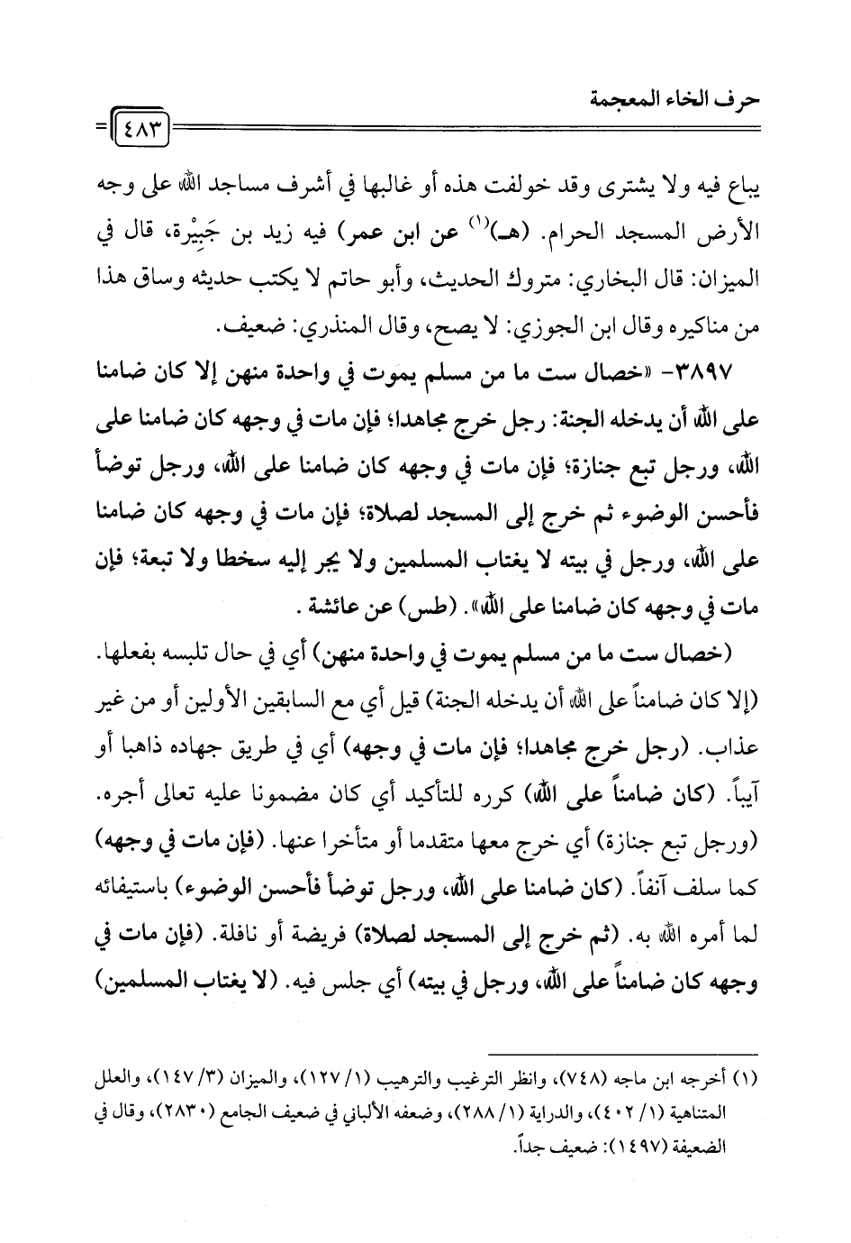 3897 - "خصال ست ما من مسلم يموت في واحدة منهن إلا كان ضامنا على الله أن يدخله الجنة: رجل خرج مجاهدا؛ فإن مات في وجهه كان ضامنا على الله، ورجل تبع جنازة؛ فإن مات في وجهه كان ضامنا على الله، ورجل توضأ فأحسن الوضوء ثم خرج إلى المسجد لصلاة؛ فإن مات في وجهه كان ضامنا على الله، ورجل في بيته لا يغتاب المسلمين ولا يجر إليه سخطا ولا تبعة؛ فإن مات في وجهه كان ضامنا على الله". (طس) عن عائشة.
