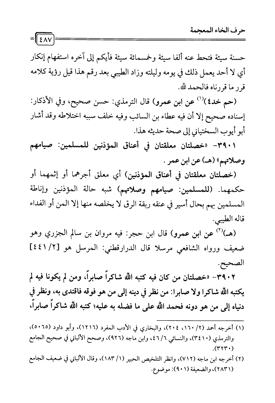 3902 - "خصلتان من كان فيه كتبه الله شاكراً صابراً، ومن لم يكونا فيه لم يكتبه الله شاكرًا ولا صابرًا: من نظر في دينه إلى من هو فوقه فاقتدى به، ونظر في دنياه إلى من هو دونه فحمد الله على ما فضله به عليه؛ كتبه الله شاكراً صابراً،