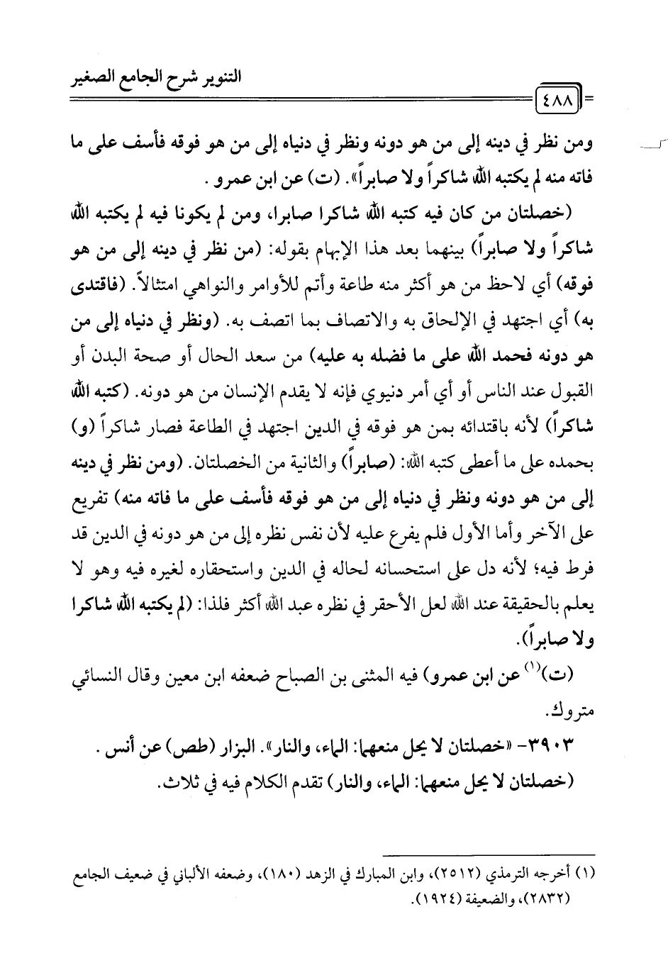 (ت) (¬1) عن ابن عمرو) فيه المثنى بن الصباح ضعفه ابن معين وقال النسائي متروك.
