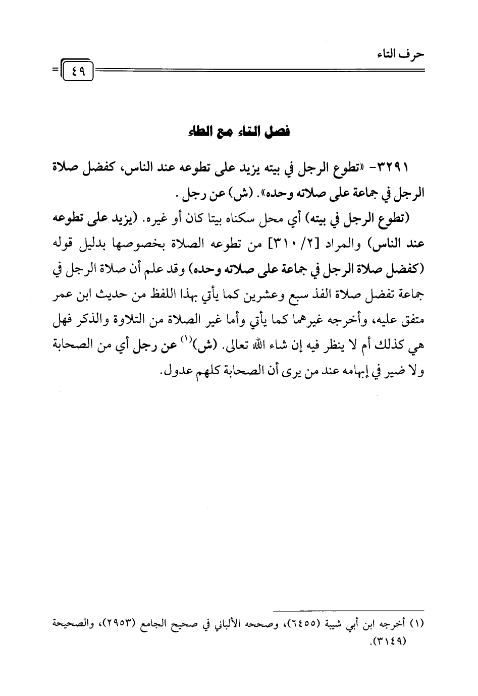 (تطوع الرجل في بيته) أي محل سكناه بيتاً كان أو غيره. (يزيد على تطوعه عند الناس) والمراد [2/ 310] من تطوعه الصلاة بخصوصها بدليل قوله (كفضل صلاة الرجل في جماعة على صلاته وحده) وقد علم أن صلاة الرجل في جماعة تفضل صلاة الفذ سبع وعشرين كما يأتي بهذا اللفظ من حديث ابن عمر متفق عليه، وأخرجه غيرهما كما يأتي وأما غير الصلاة من التلاوة والذكر فهل هي كذلك أم لا ينظر فيه إن شاء الله تعالى. (ش) (¬1) عن رجل أي من الصحابة ولا ضير في إبهامه عند من يرى أن الصحابة كلهم عدول.