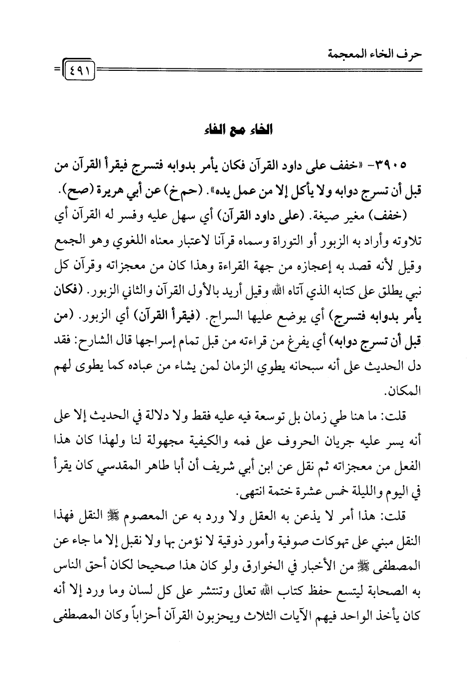 3905 - " خفف على داود القرآن فكان يأمر بدوابه فتسرج فيقرأ القرآن من قبل أن تسرج دوابه ولا يأكل إلا من عمل يده". (حم خ) عن أبي هريرة (صح).