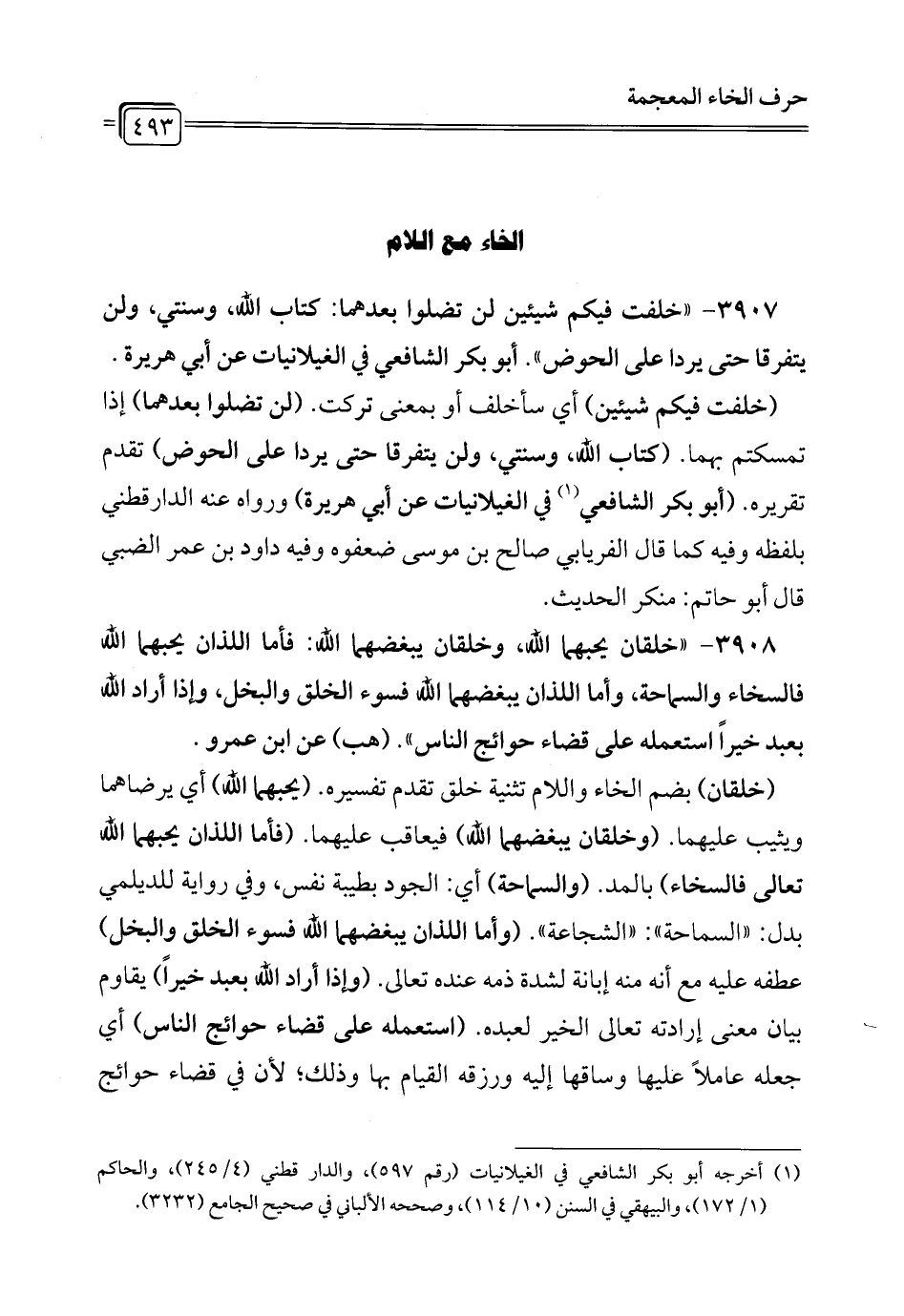 3907 - " خلفت فيكم شيئين لن تضلوا بعدهما: كتاب الله، وسنتي، ولن يتفرقا حتى يردا على الحوض". أبو بكر الشافعي في الغيلانيات عن أبي هريرة.