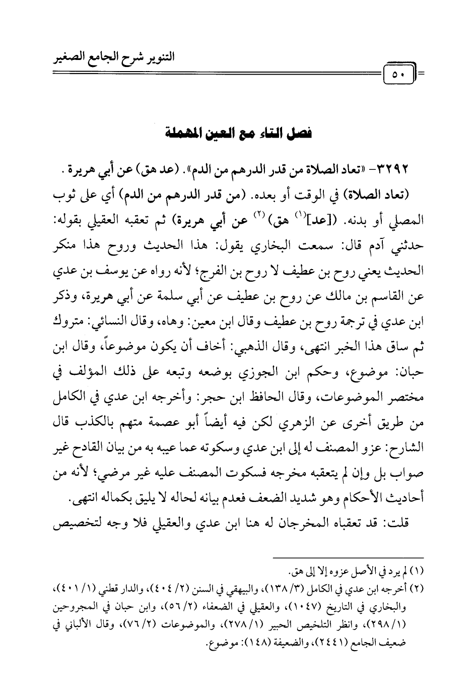 (تعاد الصلاة) في الوقت أو بعده. (من قدر الدرهم من الدم) أي على ثوب المصلي أو بدنه. ([عد] (¬1) هق) (¬2) عن أبي هريرة) ثم تعقبه العقيلي بقوله: حدثني آدم قال: سمعت البخاري يقول: هذا الحديث وروح هذا منكر الحديث يعني روح بن عطيف لا روح بن الفرج؛ لأنه رواه عن يوسف بن عدي عن القاسم بن مالك عن روح بن عطيف عن أبي سلمة عن أبي هريرة، وذكر ابن عدي في ترجمة روح بن عطيف وقال ابن معين: وهاه, وقال النسائي: متروك ثم ساق هذا الخبر انتهى، وقال الذهبي: أخاف أن يكون موضوعاً، وقال ابن حبان: موضوع، وحكم ابن الجوزي بوضعه وتبعه على ذلك المؤلف في مختصر "الموضوعات" وقال الحافظ ابن حجر: وأخرجه ابن عدي في الكامل من طريق أخرى عن الزهري لكن فيه أيضاً أبو عصمة متهم بالكذب قال الشارح: عزو المصنف له إلى ابن عدي وسكوته عما عيبه به من بيان القادح غير صواب بل وإن لم يتعقبه مخرجه فسكوت المصنف عليه غير مرضي؛ لأنه من أحاديث الأحكام وهو شديد الضعف فعدم بيانه لحاله لا يليق بكماله انتهى.