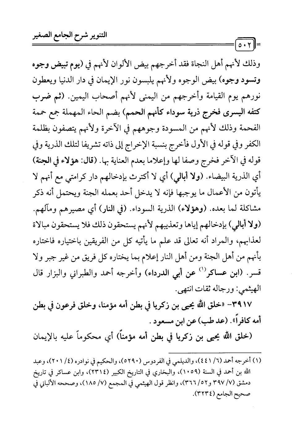 وذلك لأنهم أهل النجاة فقد أخرجهم بيض الألوان لأنهم في (يوم تبيض وجوه وتسود وجوه) بيض الوجوه ولأنهم يلبسون نور الإيمان في دار الدنيا ويعطون نورهم يوم القيامة وأخرجهم من اليمنى لأنهم أصحاب اليمين. (ثم ضرب كتفه اليسرى فخرج ذرية سوداء كأنهم الحمم) بضم الحاء المهملة جمع حممة الفحمة وذلك لأنهم من المسودة وجوههم في الآخرة ولأنهم يتصفون بظلمة الكفر وفي قوله في الأول فأخرج بنسبة الإخراج إلى ذاته تشريفا لتلك الذرية وفي قوله في الآخر فخرج وصفا لها وإعلاما بعدم العناية بها. (قال: هؤلاء في الجنة) أي الذرية البيضاء. (ولا أبالي) أي لا أكترث بإدخالهم دار كرامتي مع أنهم لا يأتون من الأعمال ما يوجبها فإنه لا يدخل أحد بعمله الجنة ويحتمل أنه ذكر مشاكلة لما بعده. (وهؤلاء) الذرية السوداء. (في النار) أي مصيرهم ومآلهم. (ولا أبالي) بإدخالهم إياها وتعذيبهم لأنهم يستحقون ذلك فلا يستحقون مبالاة لعذابهم، والمراد أنه تعالى قد علم ما يأتيه كل من الفريقين باختياره فاختاره بأنهم من أهل الجنة ومن أهل النار إعلام بما يختاره كل فريق من غير جبر ولا قسر. (ابن عساكر (¬1) عن أبي الدرداء) وأخرجه أحمد والطبراني والبزار قال الهيثمي: ورجاله ثقات انتهى.
