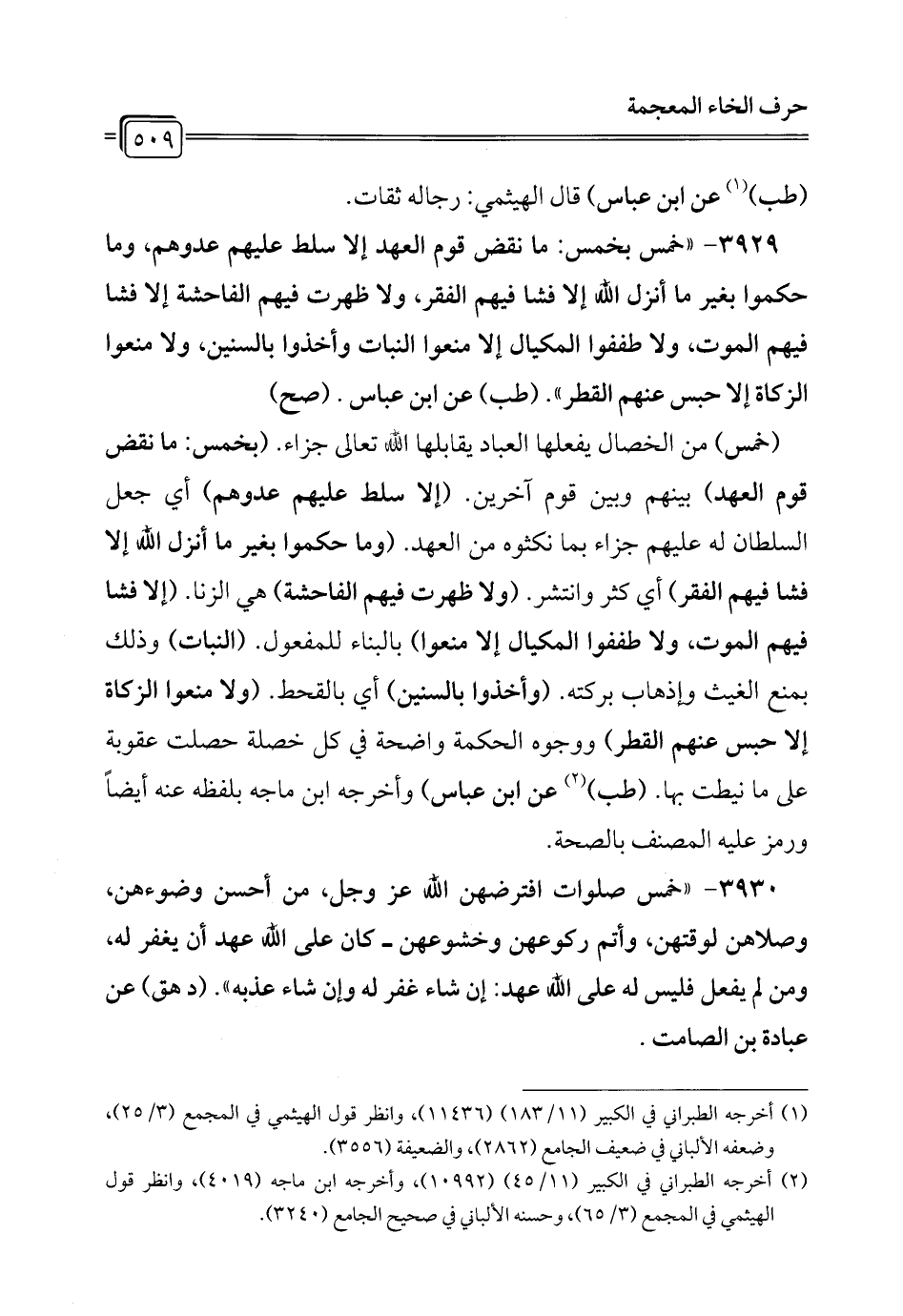 3929 - "خمس بخمس: ما نقض قوم العهد إلا سلط عليهم عدوهم، وما حكموا بغير ما أنزل الله إلا فشا فيهم الفقر، ولا ظهرت فيهم الفاحشة إلا فشا فيهم الموت، ولا طففوا المكيال إلا منعوا النبات وأخذوا بالسنين، ولا منعوا الزكاة إلا حبس عنهم القطر". (طب) عن ابن عباس. (صح)