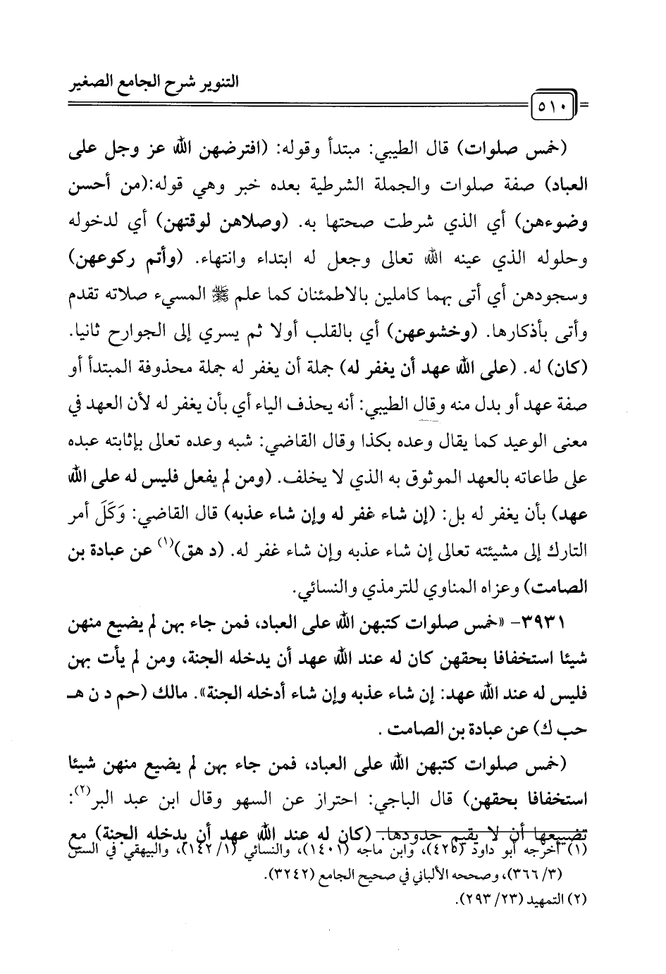 3931 - "خمس صلوات كتبهن الله على العباد، فمن جاء بهن لم يضيع منهن شيئاً استخفافا بحقهن كان له عند الله عهد أن يدخله الجنة، ومن لم يأت بهن فليس له عند الله عهد: إن شاء عذبه وإن شاء أدخله الجنة". مالك (حم د ن هـ حب ك) عق عبادة بن الصامت.
