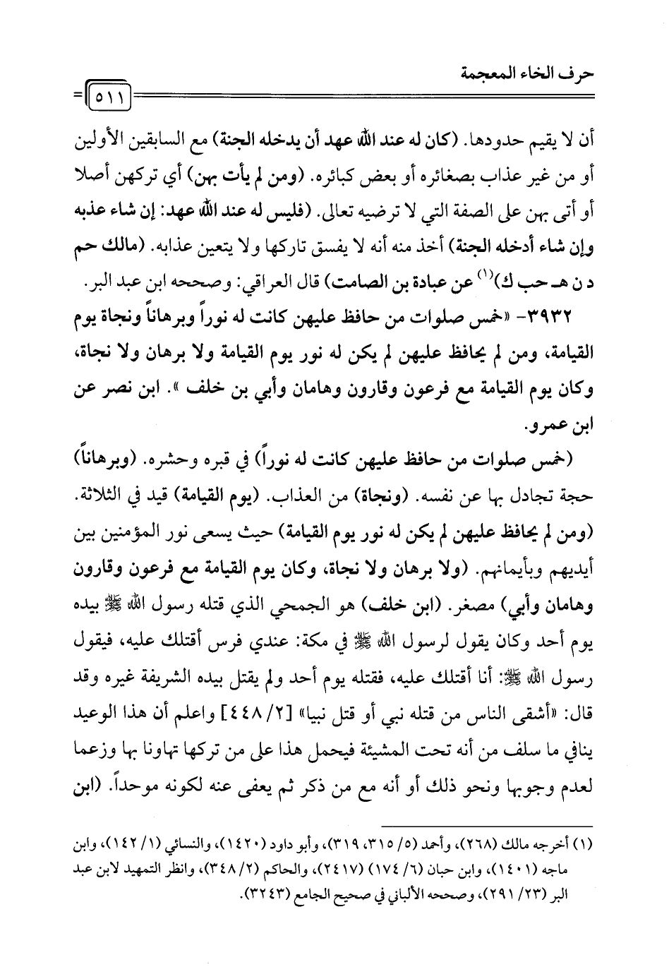 3932 - "خمس صلوات من حافظ عليهن كانت له نورًا وبرهانًا ونجاة يوم القيامة، ومن لم يحافظ عليهن لم يكن له نور يوم القيامة ولا برهان ولا نجاة، وكان يوم القيامة مع فرعون وقارون وهامان وأبي بن خلف". ابن نصر عن ابن عمرو.