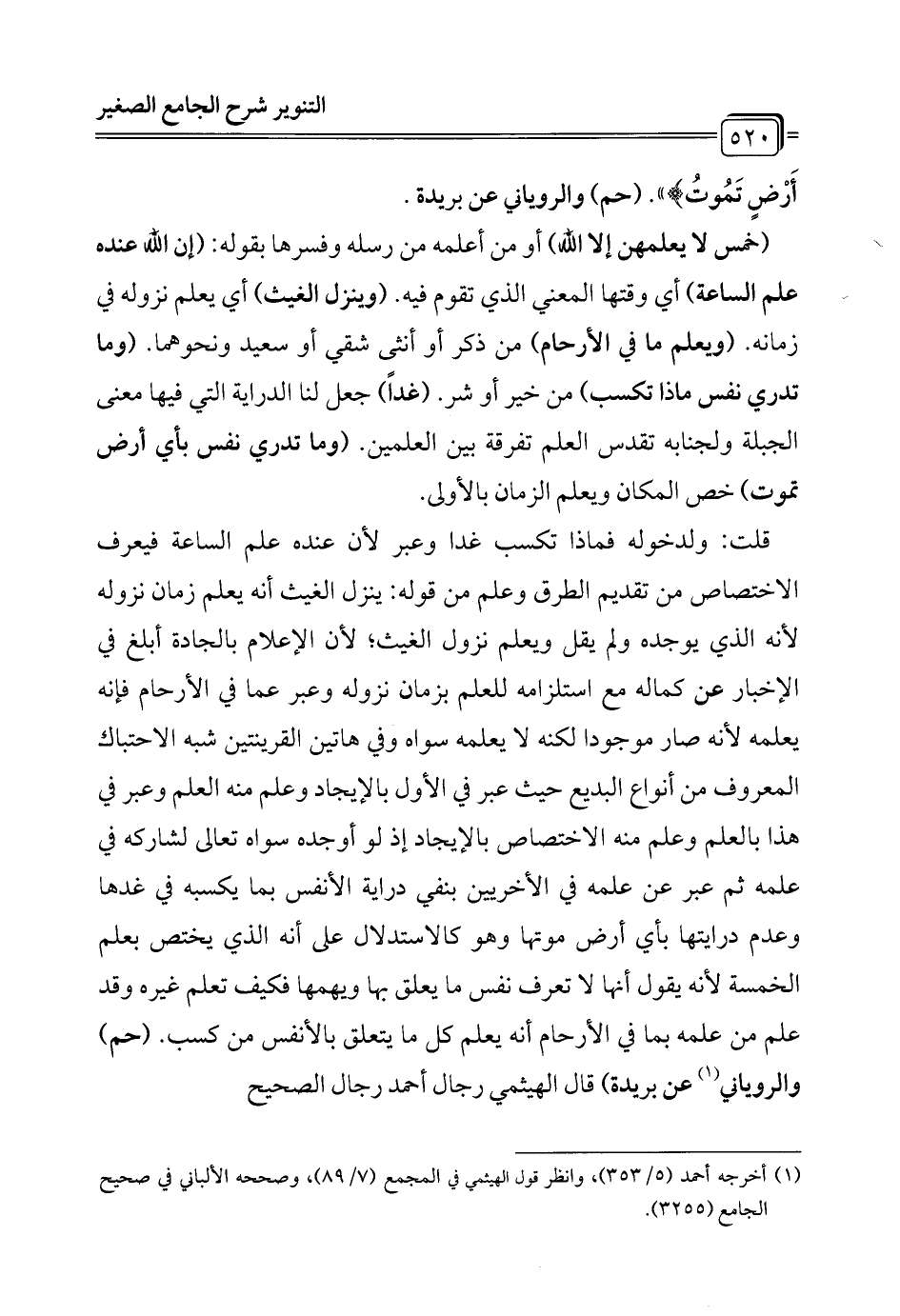 قلت: ولدخوله فماذا تكسب غدا وعبر لأن عنده علم الساعة فيعرف الاختصاص من تقديم الطرق وعلم من قوله: ينزل الغيث أنه يعلم زمان نزوله لأنه الذي يوجده ولم يقل ويعلم نزول الغيث؛ لأن الإعلام بالجادة أبلغ في الإخبار عن كماله مع استلزامه للعلم بزمان نزوله وعبر عما في الأرحام فإنه يعلمه لأنه صار موجودا لكنه لا يعلمه سواه وفي هاتين القرينتين شبه الاحتباك المعروف من أنواع البديع حيث عبر في الأول بالإيجاد وعلم منه العلم وعبر في هذا بالعلم وعلم منه الاختصاص بالإيجاد إذ لو أوجده سواه تعالى لشاركه في علمه ثم عبر عن علمه في الأخريين بنفي دراية الأنفس بما يكسبه في غدها وعدم درايتها بأي أرض موتها وهو كالاستدلال على أنه الذي يختص بعلم الخمسة لأنه يقول أنها لا تعرف نفس ما يعلق بها ويهمها فكيف تعلم غيره وقد علم من علمه بما في الأرحام أنه يعلم كل ما يتعلق بالأنفس من كسب. (حم) والروياني (¬1) عن بريدة) قال الهيثمي رجال أحمد رجال الصحيح