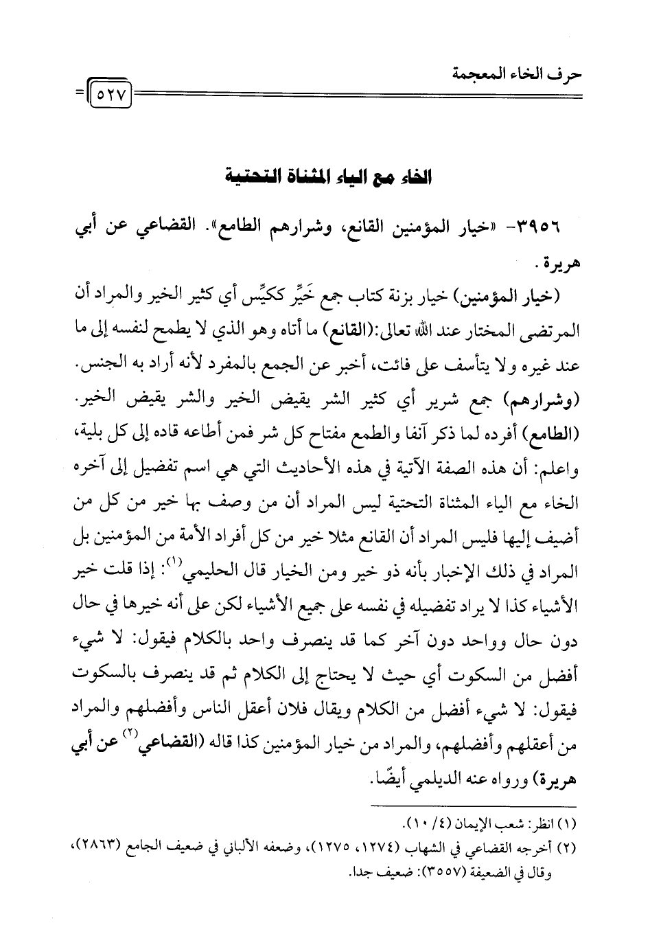 3956 - " خيار المؤمنين القانع، وشرارهم الطامع". القضاعي عن أبي هريرة.