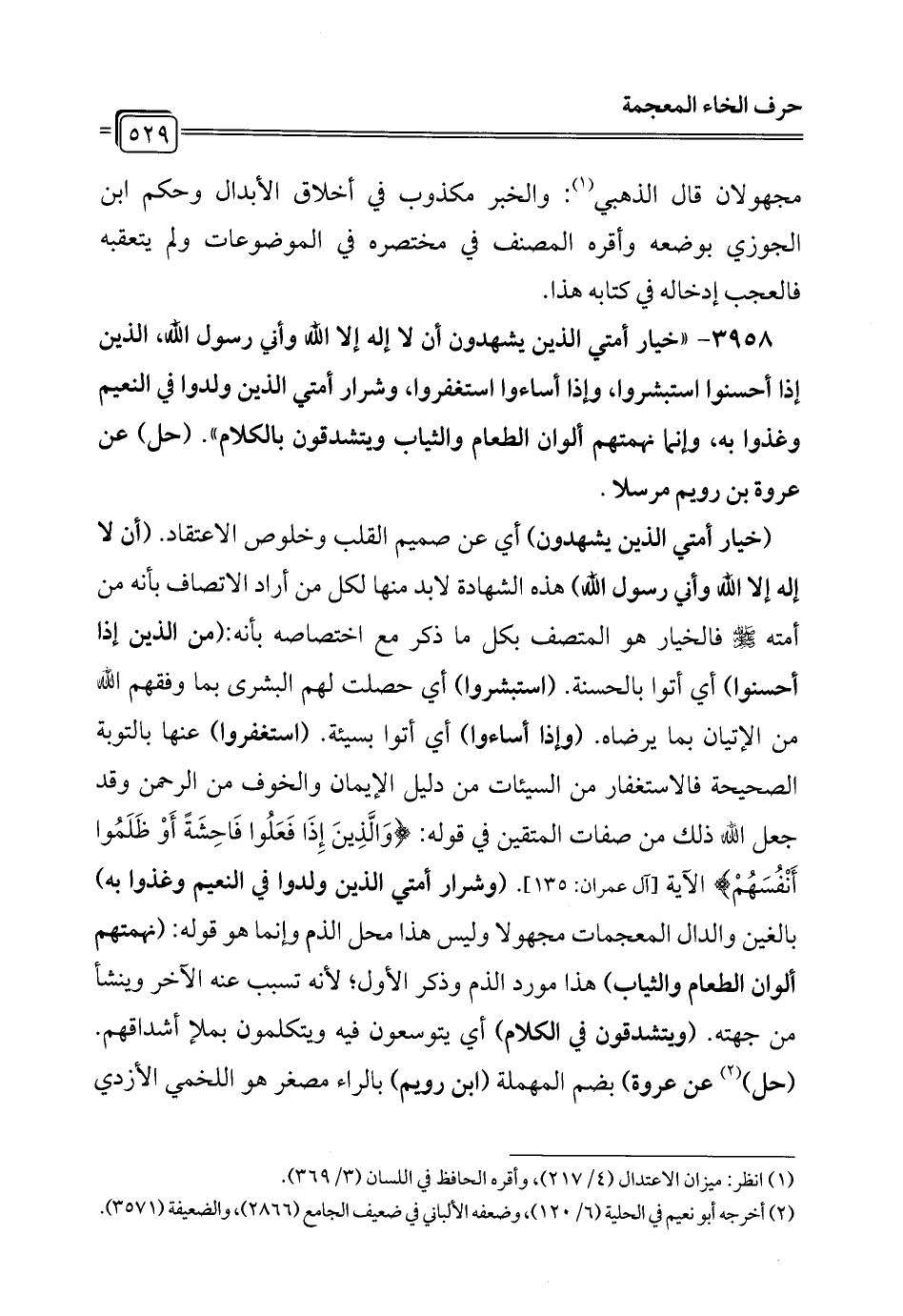 3958 - "خيار أمتي الذين يشهدون أن لا إله إلا الله وأني رسول الله، الذين إذا أحسنوا استبشروا، وإذا أساءوا استغفروا، وشرار أمتي الذين ولدوا في النعيم وغذوا به، وإنما نهمتهم ألوان الطعام والثياب ويتشدقون بالكلام". (حل) عن عروة بن رويم مرسلاً.