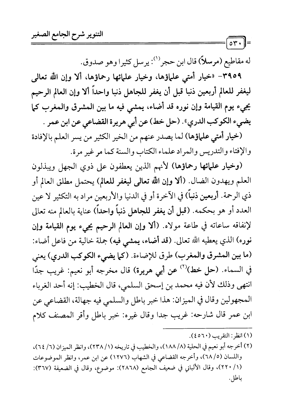 (وخيار علمائها رحماؤها) لأنهم الذين يعطفون على ذوي الجهل ويبذلون العلم ويهدون الضال. (ألا وإن الله تعالى ليغفر للعالم) يحتمل مطلق العالم أو ذي الرحمة. أربعين ذنباً) في الآخرة أو في الدنيا والأربعين مراد به التكثير لا عين العدد أو هو بحكمه. (قبل أن يغفر للجاهل ذنبًا واحداً) عناية بالعالم منه تعالى لإنفاقه ساعاته في طاعة مولاه. (ألا وإن العالم الرحيم يجيء يوم القيامة وإن نوره) الذي يعطيه الله تعالى. (قد أضاء، يمشي فيه) جملة خالية من فاعل أضاء: (ما بين المشرق والمغرب) طرق للإضاءة. (كما يضيء الكوكب الدري) يعني في السماء. (حل خط) (¬2) عن أبي هريرة) قال مخرجه أبو نعيم: غريب جدًا انتهى وذلك لأن فيه محمَّد بن إسحاق السلمي، قال الخطيب: إنه أحد الغرباء المجهولين وقال في الميزان: هذا خبر باطل والسلمي فيه جهالة، القضاعي عن ابن عمر قال شارحه: غريب جدا وقال غيره: خبر باطل وأقر المصنف كلام