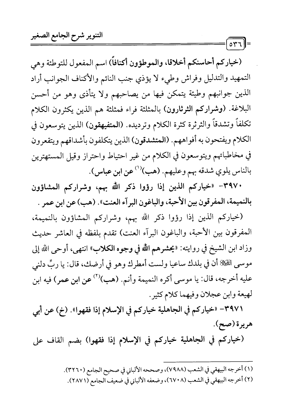 3970 - "خياركم الذين إذا رؤوا ذكر الله بهم، وشراركم المشاؤون بالنميمة، المفرقون بين الأحبة، والباغون البرآء العنت". (هب) عن ابن عمر.
