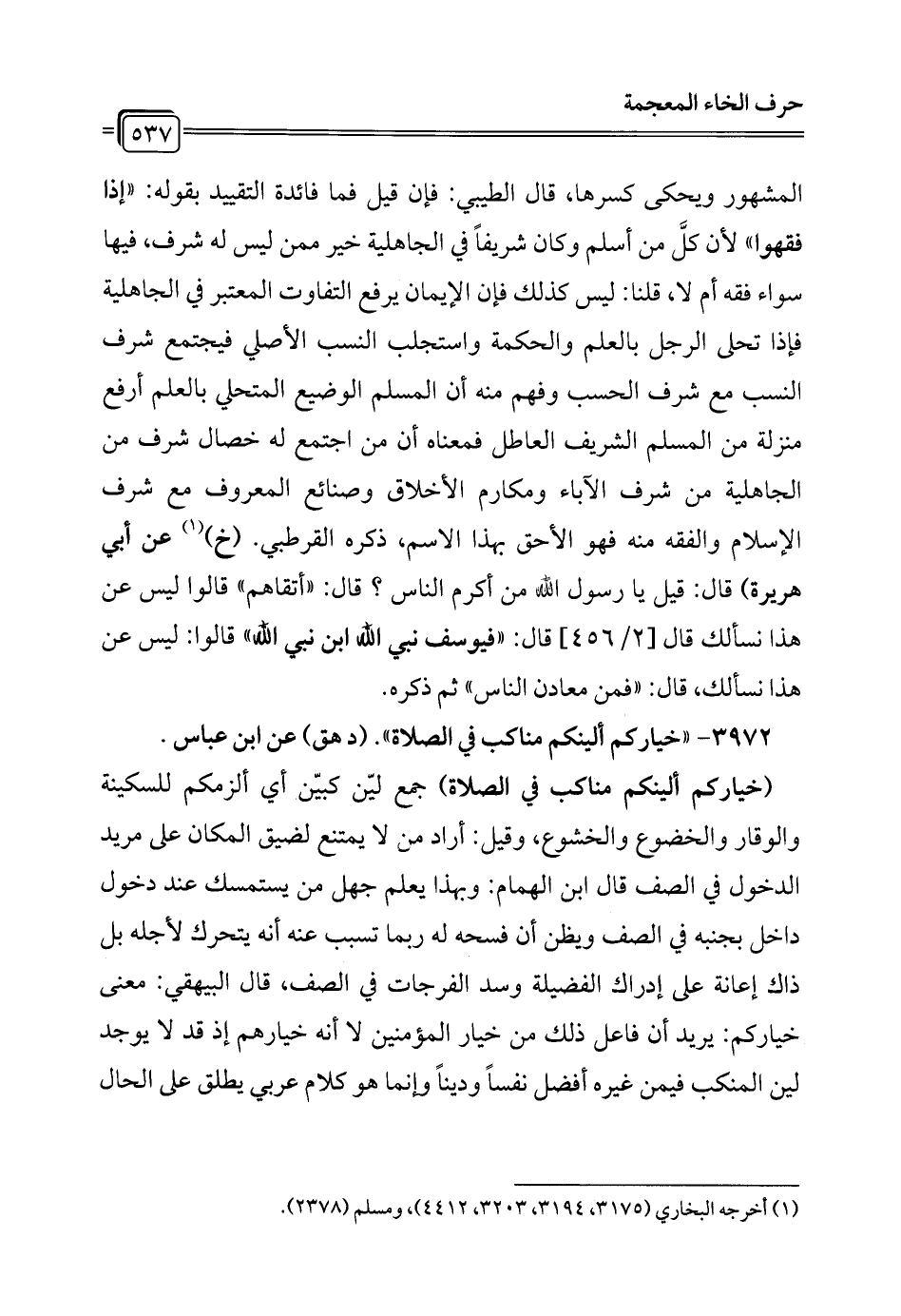 المشهور ويحكى كسرها، قال الطيبي: فإن قيل فما فائدة التقييد بقوله: "إذا فقهوا" لأن كلَّ من أسلم وكان شريفاً في الجاهلية خير ممن ليس له شرف، فيها سواء فقه أم لا، قلنا: ليس كذلك فإن الإيمان يرفع التفاوت المعتبر في الجاهلية فإذا تحلى الرجل بالعلم والحكمة واستجلب النسب الأصلي فيجتمع شرف النسب مع شرف الحسب وفهم منه أن المسلم الوضيع المتحلي بالعلم أرفع منزلة من المسلم الشريف العاطل فمعناه أن من اجتمع له خصال شرف من الجاهلية من شرف الآباء ومكارم الأخلاق وصنائع المعروف مع شرف الإِسلام والفقه منه فهو الأحق بهذا الاسم، ذكره القرطبي. (خ) (¬1) عن أبي هريرة) قال: قيل يا رسول الله من أكرم الناس؟ قال: "أتقاهم" قالوا ليس عن هذا نسألك قال [2/ 456] قال: "فيوسف نبي الله ابن نبي الله" قالوا: ليس عن هذا نسألك، قال: "فمن معادن الناس" ثم ذكره.