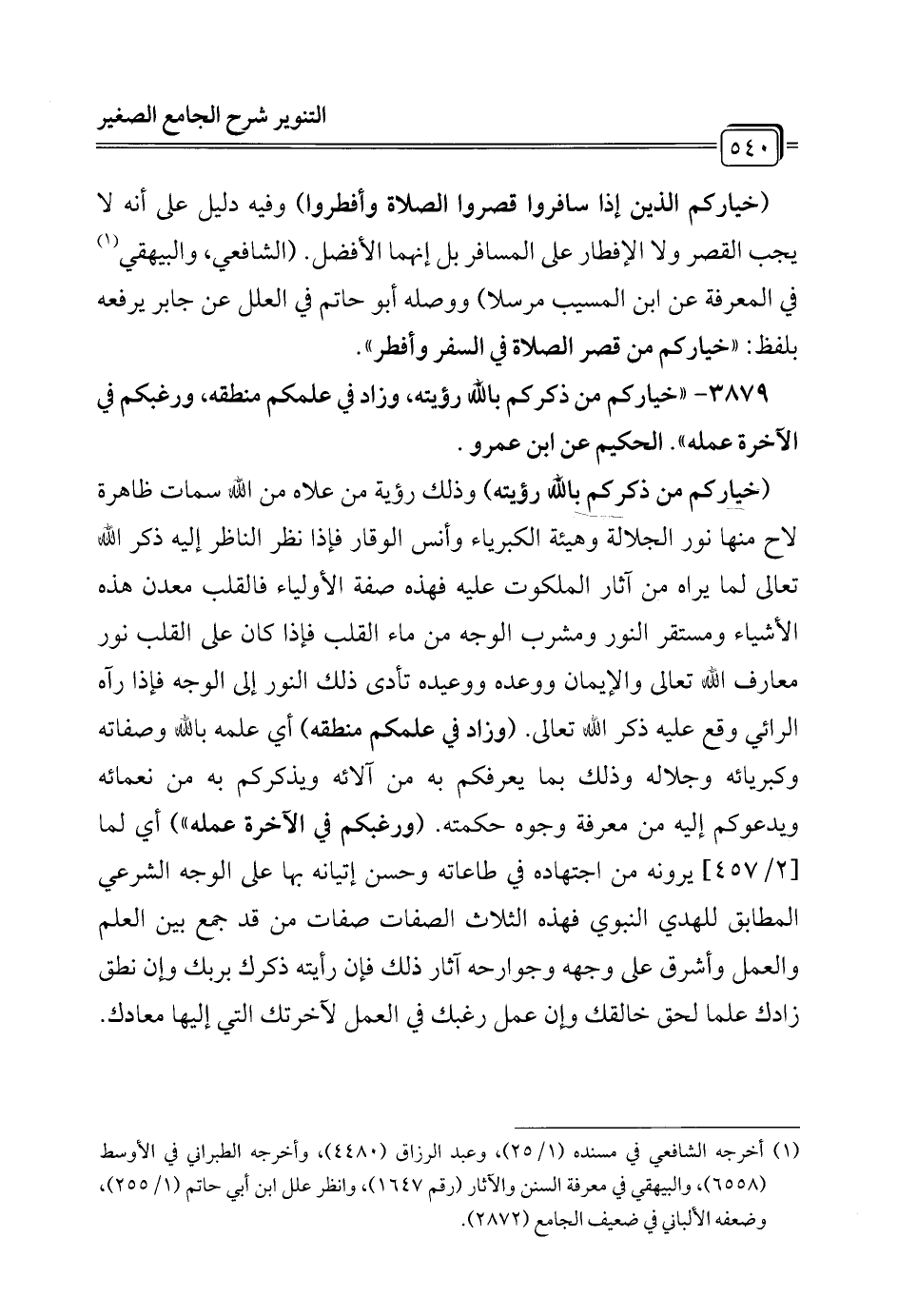 3879 - "خياركم من ذكركم بالله رؤيته، وزاد في علمكم منطقه، ورغبكم في الآخرة عمله". الحكيم عن ابن عمرو.