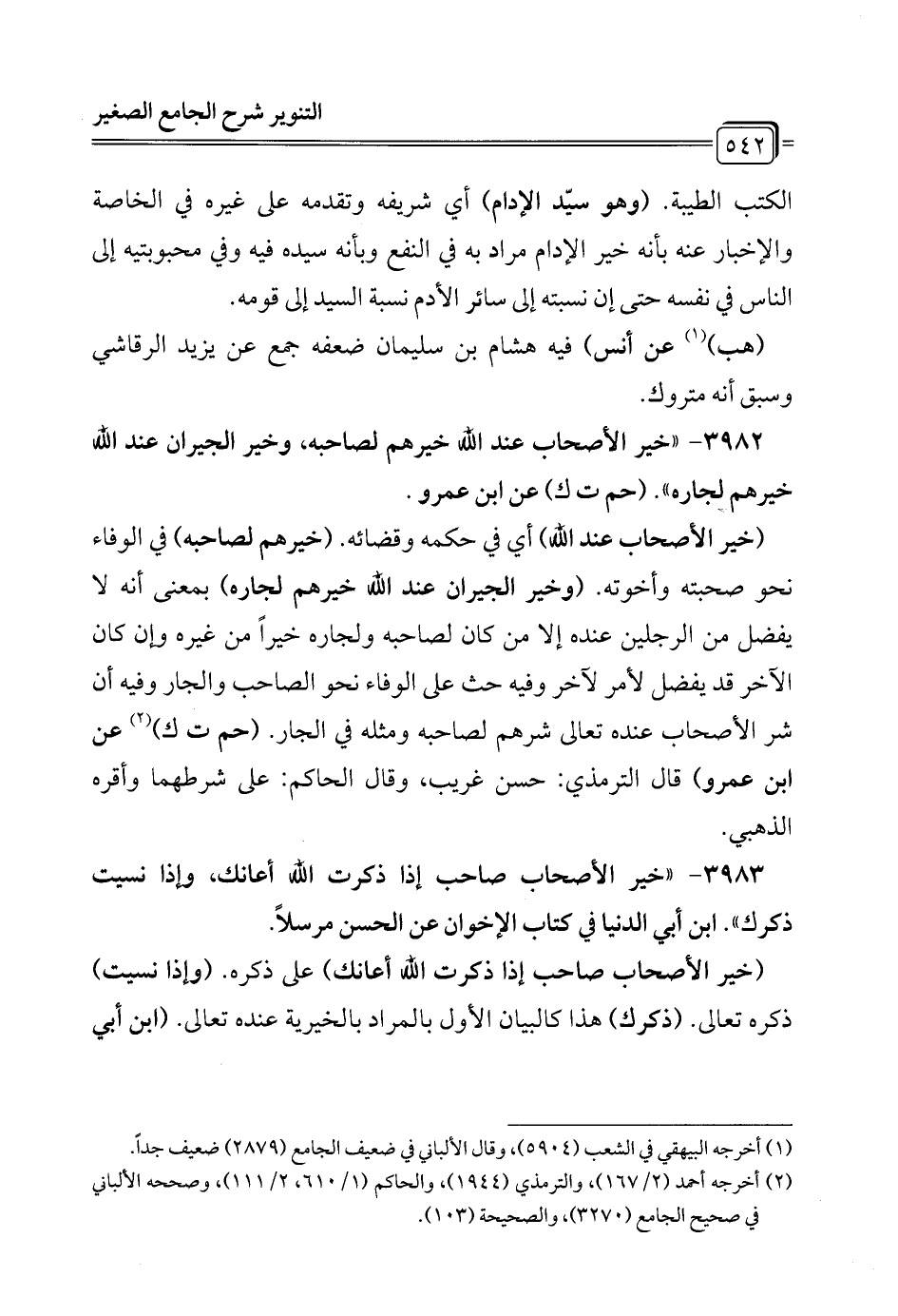 3982 - "خير الأصحاب عند الله خيرهم لصاحبه، وخير الجيران عند الله خيرهم لجاره". (حم ت ك) عن ابن عمرو.