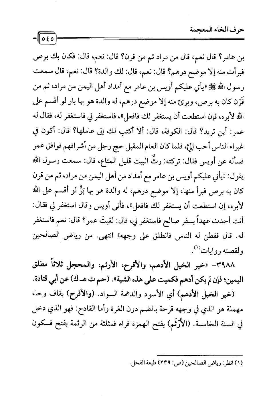 بن عامر؟ قال نعم، قال من مراد ثم من قرن؟ قال: نعم، قال: فكان بك برص فبرأت منه إلا موضع درهم؟ قال: نعم، قال: لك والدة؟ قال: نعم، قال سمعت رسول الله - صلى الله عليه وسلم - "يأتي عليكم أويس بن عامر مع أمداد أهل اليمن من مراد، ثم من قَرَن كان به برص، وبرئ منه إلا موضع درهم، له والدة هو بها بار لو أقسم على الله لأبره، فإن استطعت أن يستغفر لك فافعل"، فاستغفر لي فاستغفر له، فقال له عمر: أين تريد؟ قال: الكوفة، قال: ألا أكتب لك إلى عاملها؟ قال: أكون في غبراء الناس أحب إليَّ، فلما كان العام المقبل حج رجل من أشرافهم فوافق عمر فسأله عن أويس فقال: تركته: رثَّ البيت قليل المتاع، قال: سمعت رسول الله - صلى الله عليه وسلم - يقول: "يأتي عليكم أويس بن عامر مع أمداد من أهل اليمن من مراد، ثم من قرن كان به برص فبرأ منها، إلا موضع درهم، له والدة هو بها بَرٌّ لو أقسم على الله لأبره، إن استطعت أن يستغفر لك فافعل"، فأتى أويس وقال استغفر لي فقال: أنت أحدث عهدًا بسفر صالح فاستغفر لي، قال: لقيتَ عمر؟ قال: نعم فاستغفر له. قال ففطن له الناس فانطلق على وجهه" انتهى. من رياض الصالحين ولقصته روايات (¬1).