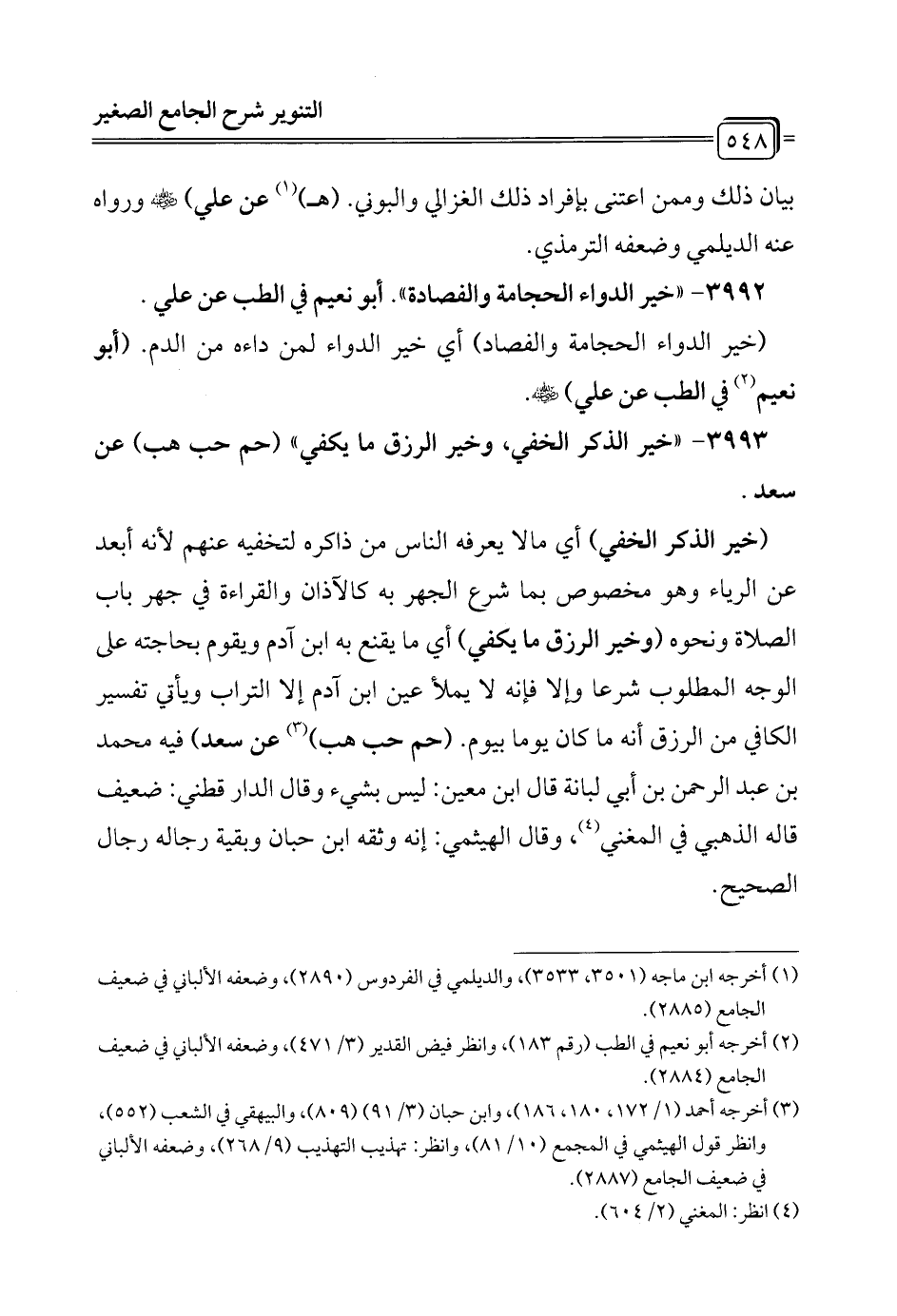 (¬2) أخرجه أبو نعيم في الطب (رقم 183)، وانظر فيض القدير (3/ 471)، وضعفه الألباني في ضعيف الجامع (2884).