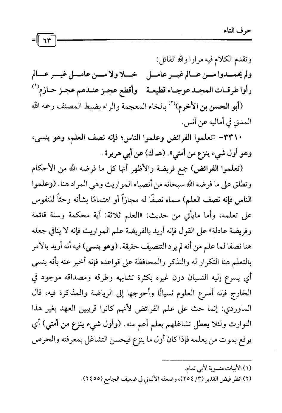 (تعلموا الفرائض) جمع فريضة والأظهر أنها كل ما فرضه الله من الأحكام وتطلق على ما فرضه الله سبحانه من أنصباء المواريث وهي المراد هنا. (وعلموا الناس فإنه نصف العلم) سماه نصفاً له مجازاً أو اهتمامًا بشأنه وحثاً للنفوس على تعلمه، وأما ما يأتي من حديث: "العلم ثلاثة: آية محكمة وسنة قائمة وفريضة عادلة" على القول فإنه أريد بالفريضة علم المواريث فإنه لا ينافي جعله هنا نصفاً لما علم من أنه لم يرد التنصيف حقيقة. (وهو ينسى) فيه أنه أريد بالأمر بالتعلم هنا التكرار له والتذكر والمحافظة على قواعده فإنه أخبر عنه بأنه ينسى أي يسرع إليه النسيان دون غيره بكثرة تشابهه وطرقه ومصداقه موجود في الخارج فإنه أسرع العلوم نسيانًا وأحوجها إلى الرياضة والمذاكرة فيه، قال الماوردي: إنما حث على علم الفرائض لأنهم كانوا قريبين العهد بغير هذا التوارث ولئلا يعطل تشاغلهم بعلم أعم منه. (وأول شيء ينزع من أمتي) أي يرفع بموت من يعلمه فإذا كان أول ما ينزع فيحسن التشاغل بمعرفته والحرص