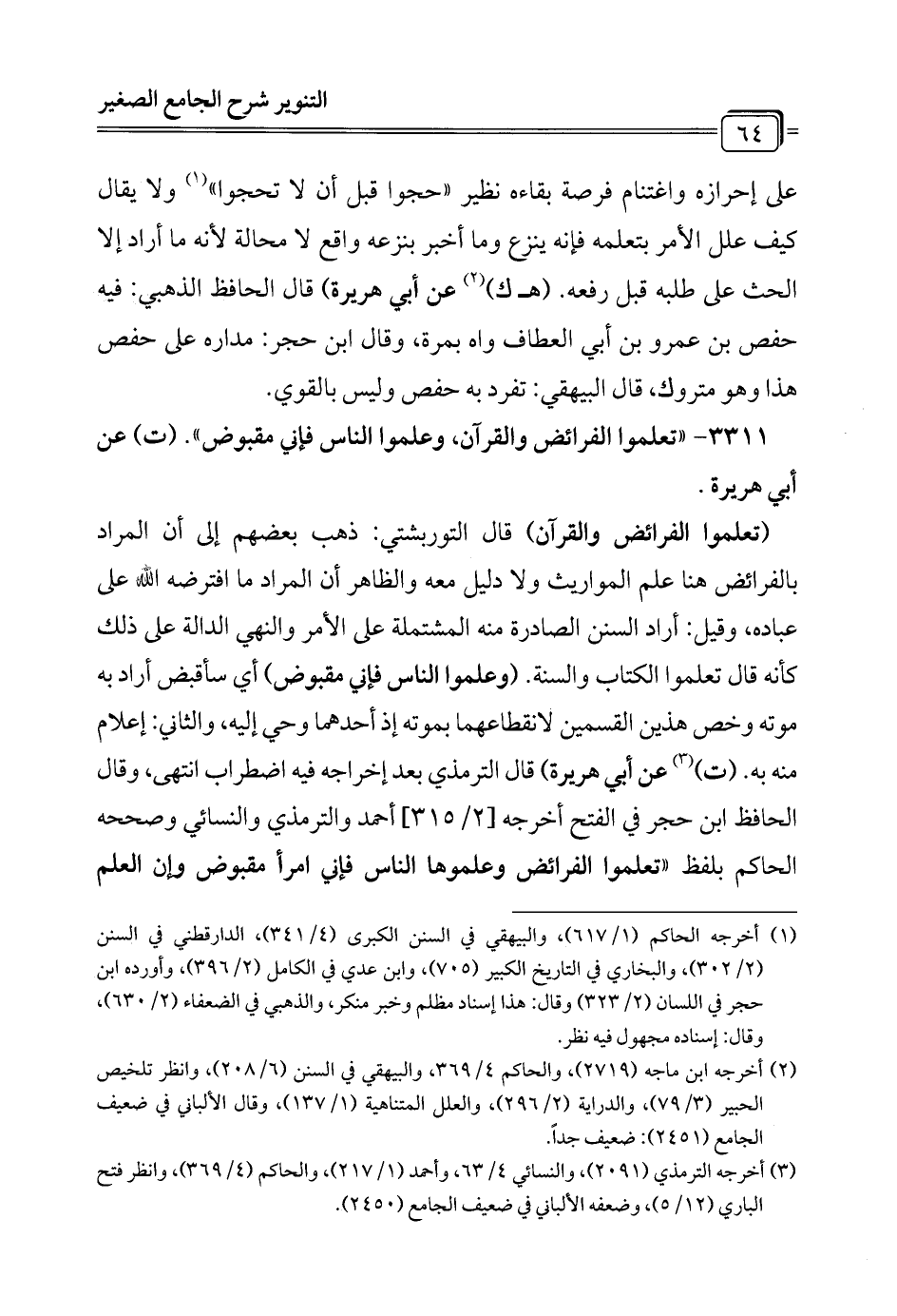 3311 - "تعلموا الفرائض والقرآن، وعلموا الناس فإني مقبوض". (ت) عن أبي هريرة.
