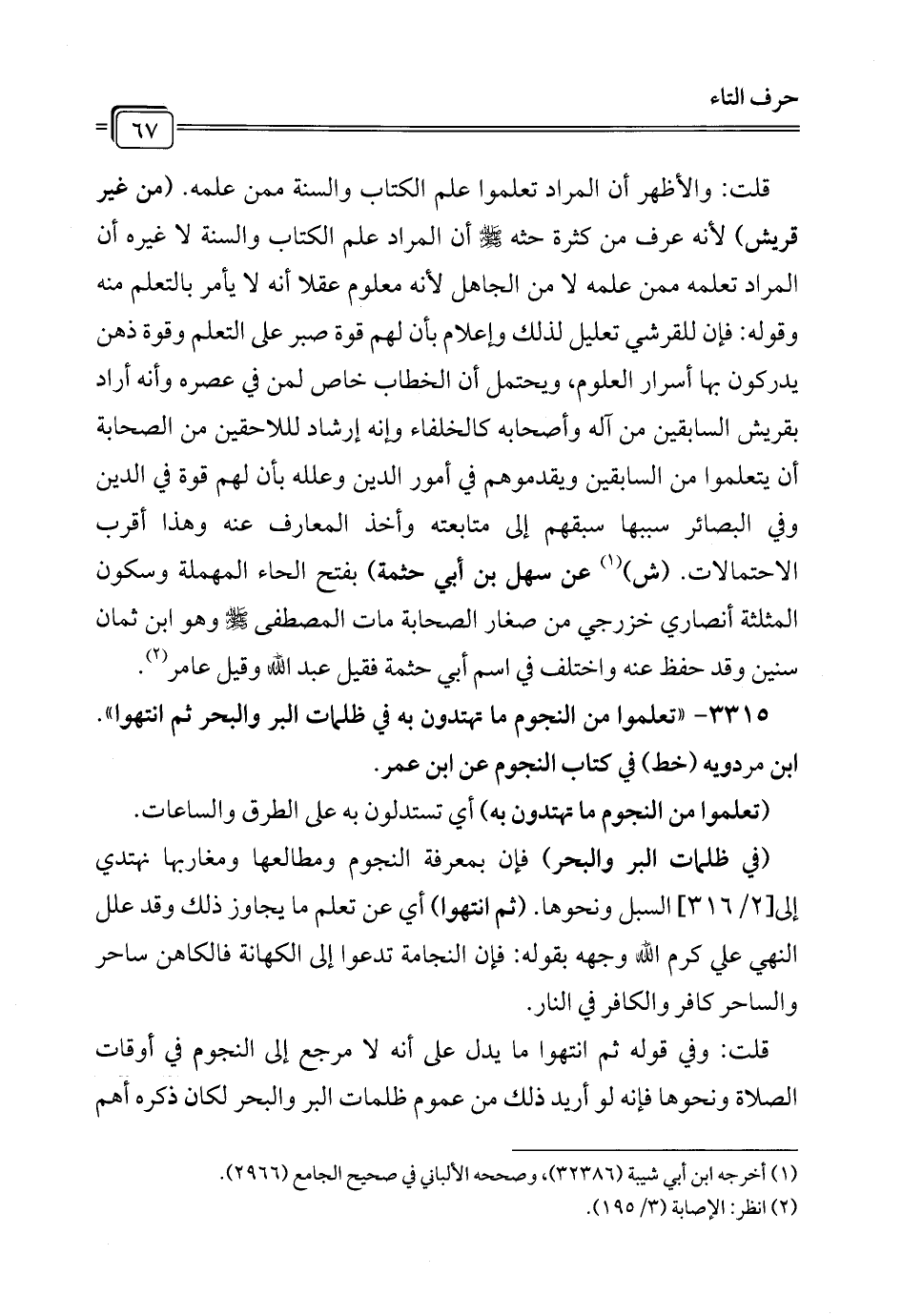 3315 - "تعلموا من النجوم ما تهتدون به في ظلمات البر والبحر ثم انتهوا". ابن مردويه (خط) في كتاب النجوم عن ابن عمر.