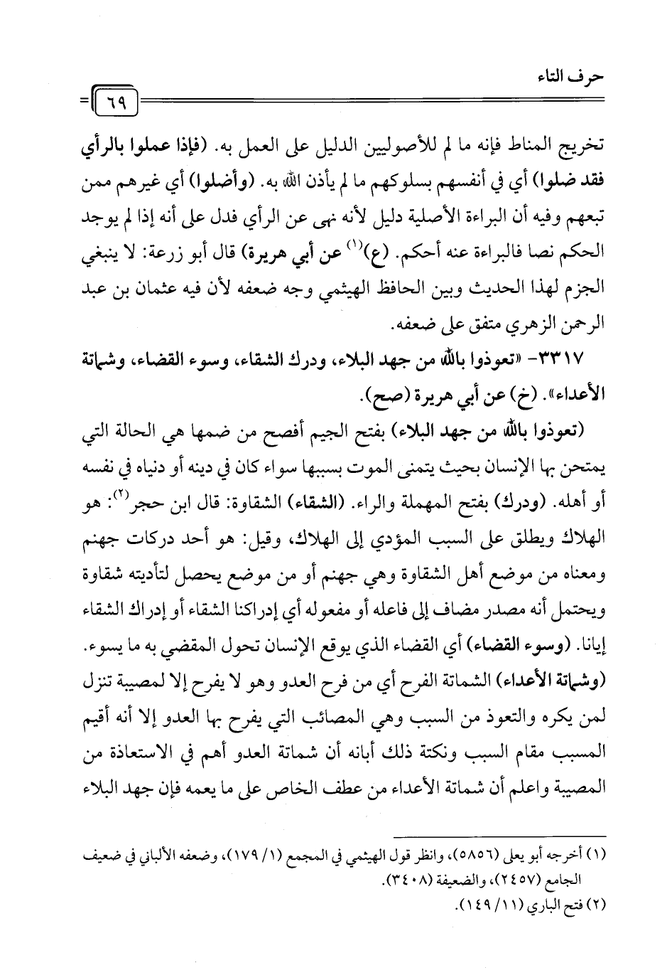 (تعوذوا بالله من جهد البلاء) بفتح الجيم أفصح من ضمها هي الحالة التي يمتحن بها الإنسان بحيث يتمنى الموت بسببها سواء كان في دينه أو دنياه في نفسه أو أهله. (ودرك) بفتح المهملة والراء. (الشقاء) الشقاوة: قال ابن حجر (¬2): هو الهلاك ويطلق على السبب المؤدي إلى الهلاك، وقيل: هو أحد دركات جهنم ومعناه من موضع أهل الشقاوة وهي جهنم أو من موضع يحصل لتأديته شقاوة ويحتمل أنه مصدر مضاف إلى فاعله أو مفعوله أي إدراكنا الشقاء أو إدراك الشقاء إيانا. (وسوء القضاء) أي القضاء الذي يوقع الإنسان تحول المقضي به ما يسوء. (وشماتة الأعداء) الشماتة الفرح أي من فرح العدو وهو لا يفرح إلا لمصيبة تنزل لمن يكره والتعوذ من السبب وهي المصائب التي يفرح بها العدو إلا أنه أقيم المسبب مقام السبب ونكتة ذلك أبانه أن شماتة العدو أهم في الاستعاذة من المصيبة واعلم أن شماتة الأعداء من عطف الخاص على ما يعمه فإن جهد البلاء