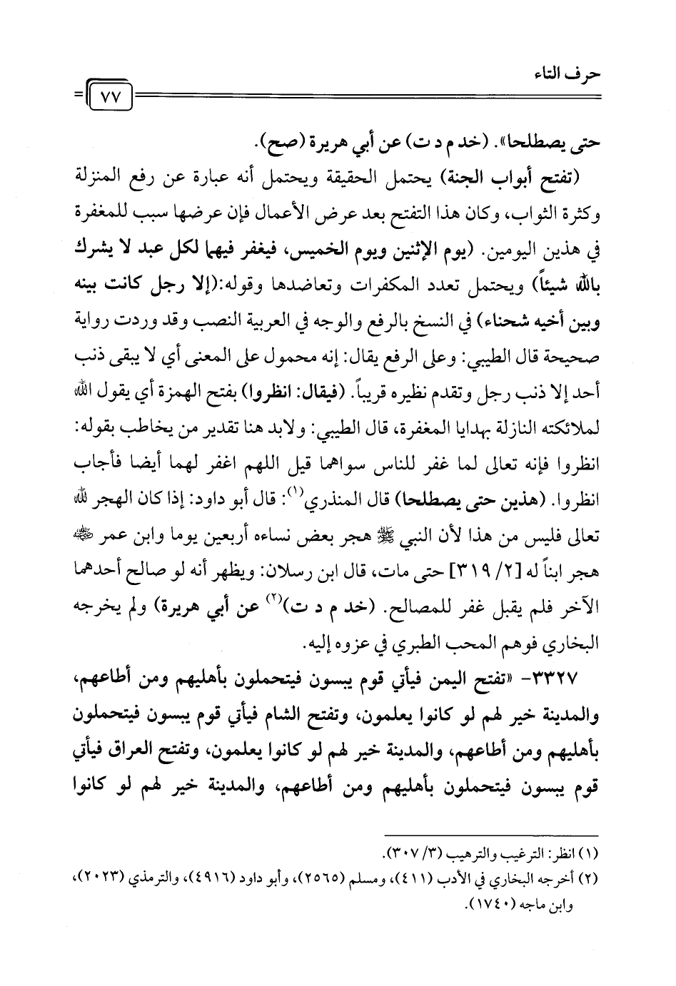 (تفتح أبواب الجنة) يحتمل الحقيقة ويحتمل أنه عبارة عن رفع المنزلة وكثرة الثواب، وكان هذا التفتح بعد عرض الأعمال فإن عرضها سبب للمغفرة في هذين اليومين. (يوم الإثنين ويوم الخميس، فيغفر فيهما لكل عبد لا يشرك بالله شيئاً) ويحتمل تعدد المكفرات وتعاضدها وقوله: (إلا رجل كانت بينه وبين أخيه شحناء) في النسخ بالرفع والوجه في العربية النصب وقد وردت رواية صحيحة قال الطيبي: وعلى الرفع يقال: إنه محمول على المعنى أي لا يبقى ذنب أحد إلا ذنب رجل وتقدم نظيره قريباً. (فيقال: انظروا) بفتح الهمزة أي يقول الله لملائكته النازلة بهدايا المغفرة، قال الطيبي: ولابد هنا تقدير من يخاطب بقوله: انظروا فإنه تعالى لما غفر للناس سواهما قيل اللهم اغفر لهما أيضاً فأجاب انظروا. (هذين حتى يصطلحا) قال المنذري (¬1): قال أبو داود: إذا كان الهجر لله تعالى فليس من هذا لأن النبي - صلى الله عليه وسلم - هجر بعض نساءه أربعين يوما وابن عمر - رضي الله عنه - هجر ابناً له [2/ 319] حتى مات، قال ابن رسلان: ويظهر أنه لو صالح أحدهما الآخر فلم يقبل غفر للمصالح. (خد م د ت) (¬2) عن أبي هريرة) ولم يخرجه البخاري فوهم المحب الطبري في عزوه إليه.