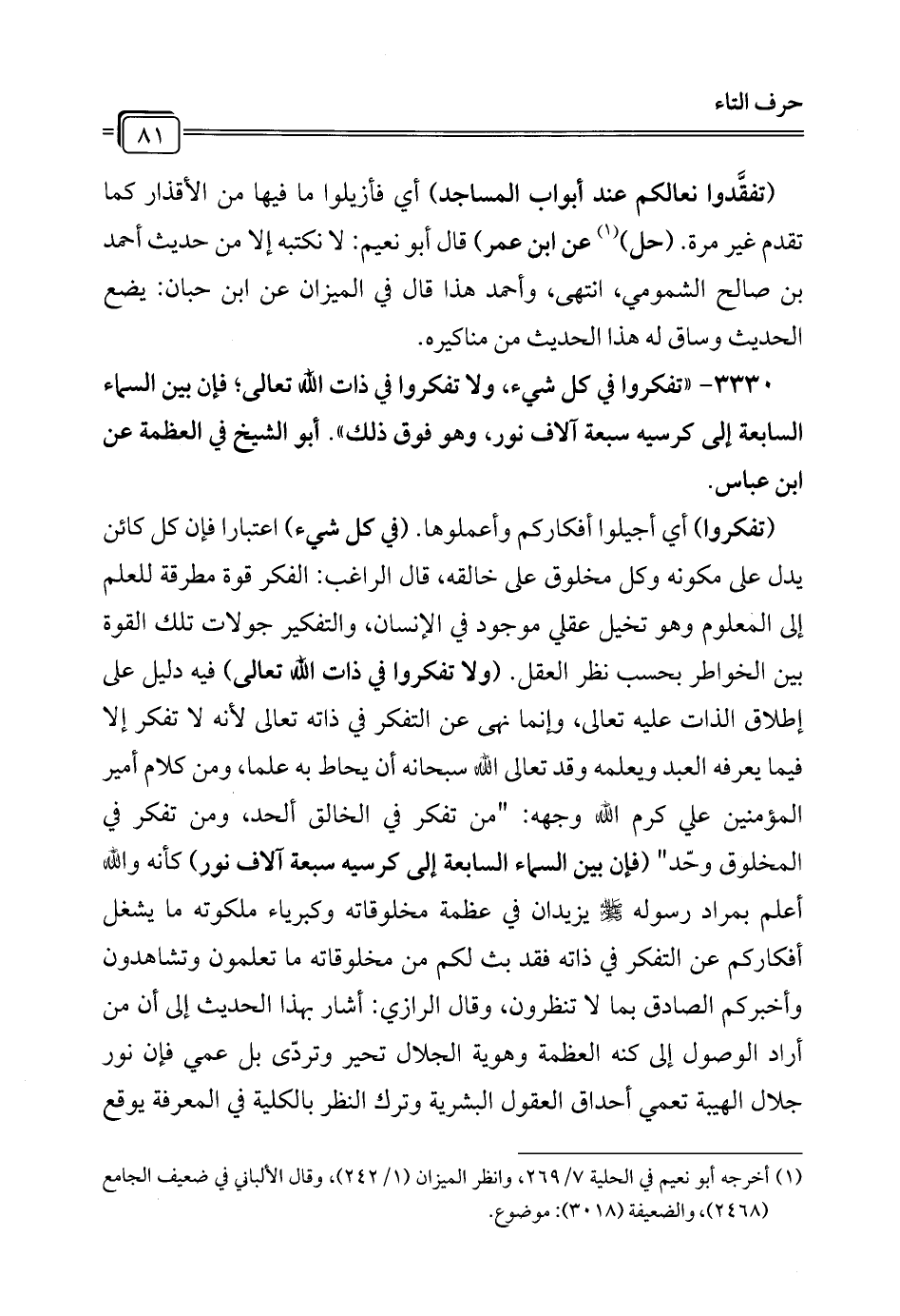 3330 - "تفكروا في كل شيء، ولا تفكروا في ذات الله تعالى؛ فإن بين السماء السابعة إلى كرسيه سبعة آلاف نور، وهو فوق ذلك". أبو الشيخ في العظمة عن ابن عباس.