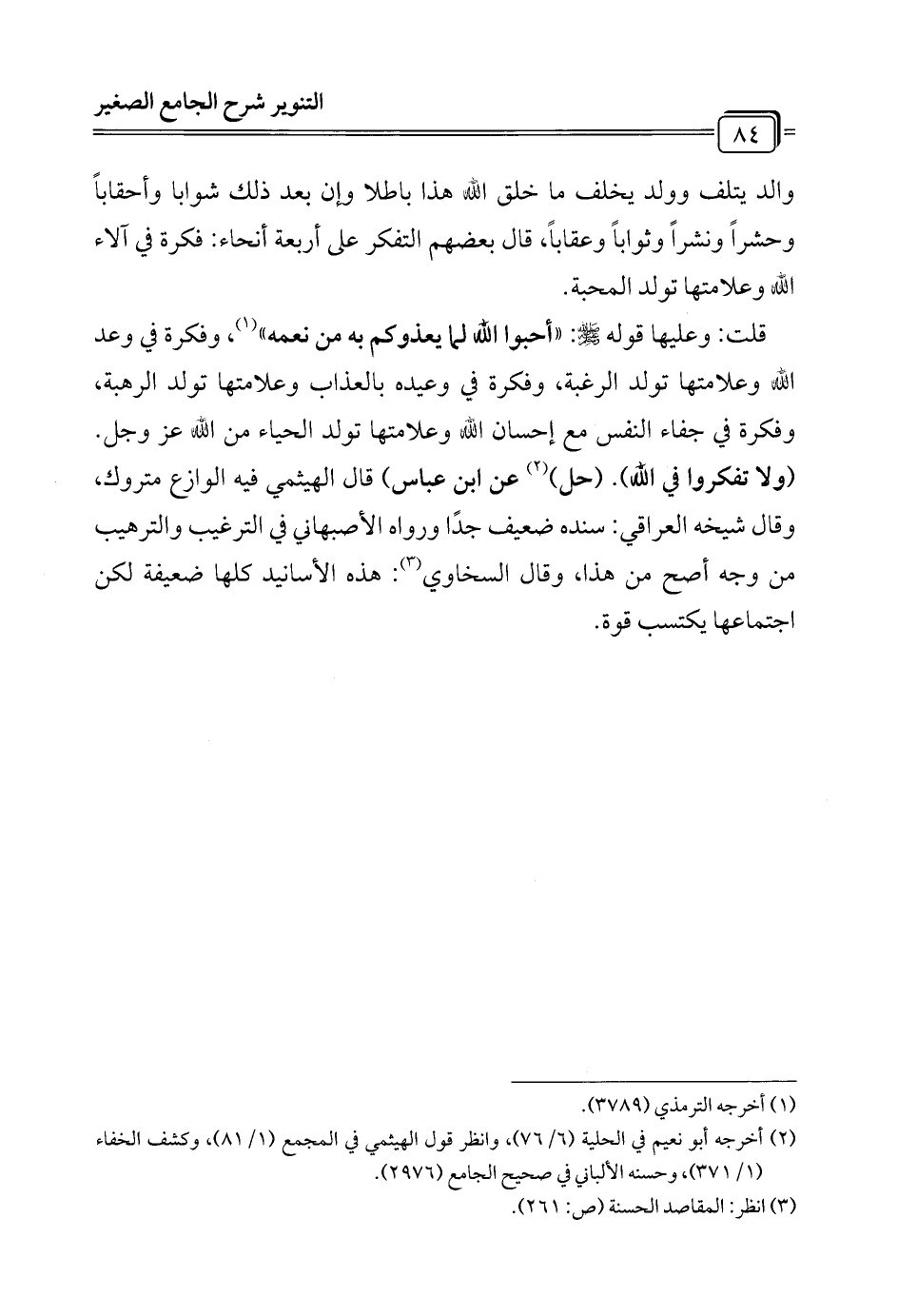 قلت: وعليها قوله - صلى الله عليه وسلم -: "أحبوا الله لما يعذوكم به من نعمه" (¬1)، وفكرة في وعد الله وعلامتها تولد الرغبة، وفكرة في وعيده بالعذاب وعلامتها تولد الرهبة، وفكرة في جفاء النفس مع إحسان الله وعلامتها تولد الحياء من الله عَزَّ وَجَلَّ. (ولا تفكروا في الله). (حل) (¬2) عن ابن عباس) قال الهيثمي فيه الوازع متروك، وقال شيخه العراقي: سنده ضعيف جدًا ورواه الأصبهاني في الترغيب والترهيب من وجه أصح من هذا، وقال السخاوي (¬3): هذه الأسانيد كلها ضعيفة لكن اجتماعها يكتسب قوة.