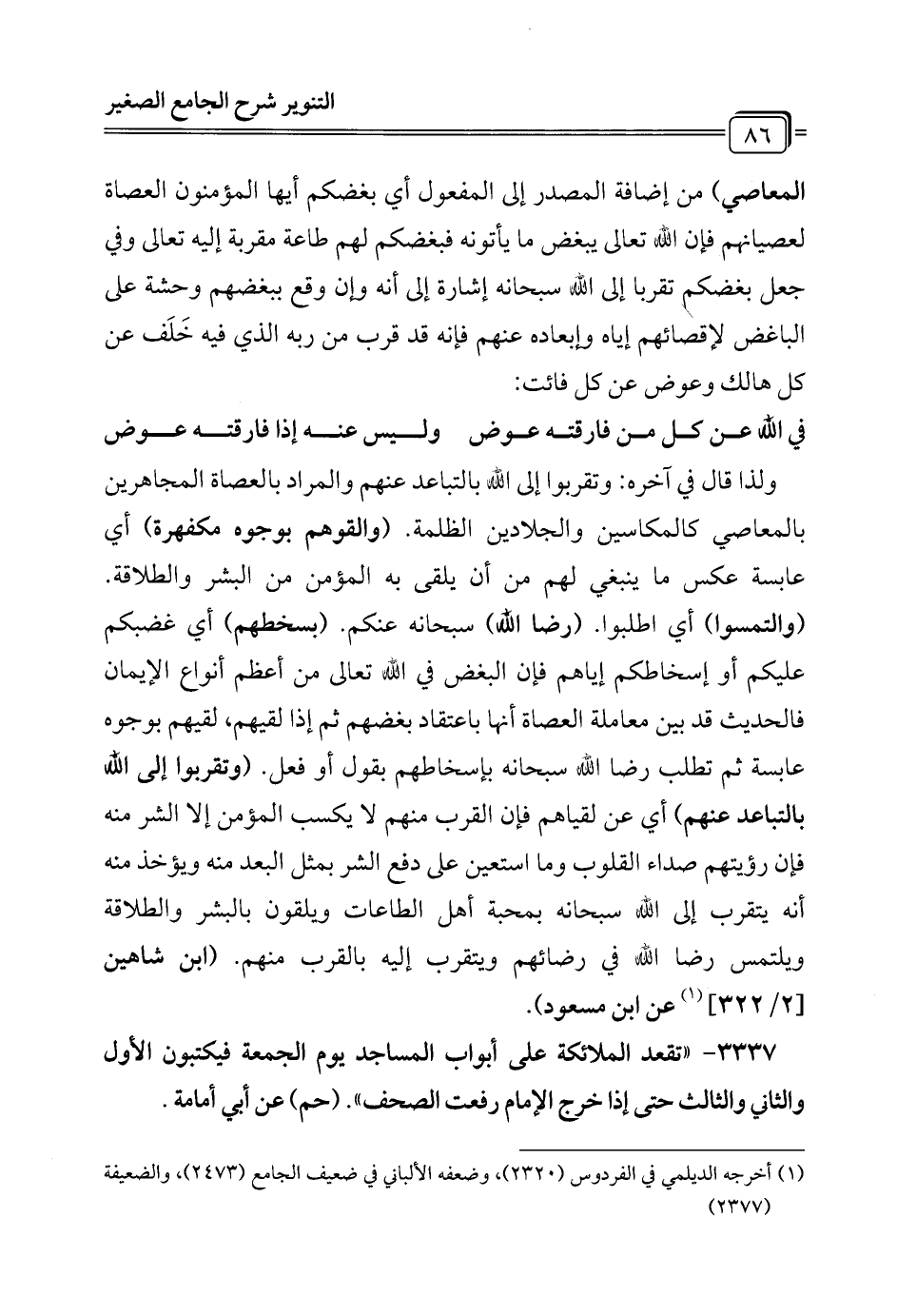 ولذا قال في آخره: وتقربوا إلى الله بالتباعد عنهم والمراد بالعصاة المجاهرين بالمعاصي كالمكاسين والجلادين الظلمة. (والقوهم بوجوه مكفهرة) أي عابسة عكس ما ينبغي لهم من أن يلقى به المؤمن من البشر والطلاقة. (والتمسوا) أي اطلبوا. (رضا الله) سبحانه عنكم. (بسخطهم) أي غضبكم عليكم أو إسخاطكم إياهم فإن البغض في الله تعالى من أعظم أنواع الإيمان فالحديث قد بين معاملة العصاة أنها باعتقاد بغضهم ثم إذا لقيهم، لقيهم بوجوه عابسة ثم تطلب رضا الله سبحانه بإسخاطهم بقول أو فعل. (وتقربوا إلى الله بالتباعد عنهم) أي عن لقياهم فإن القرب منهم لا يكسب المؤمن إلا الشر منه فإن رؤيتهم صداء القلوب وما استعين على دفع الشر بمثل البعد منه ويؤخذ منه أنه يتقرب إلى الله سبحانه بمحبة أهل الطاعات ويلقون بالبشر والطلاقة ويلتمس رضا الله في رضائهم ويتقرب إليه بالقرب منهم. (ابن شاهين [2/ 322] (¬1) عن ابن مسعود).