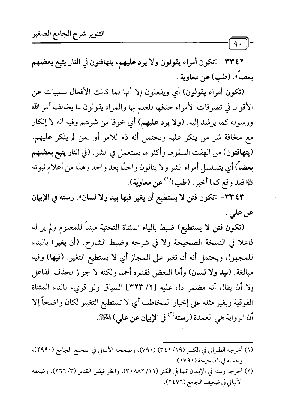 3342 - "تكون أمراء يقولون ولا يرد عليهم، يتهافتون في النار يتبع بعضهم بعضاً". (طب) عن معاوية.