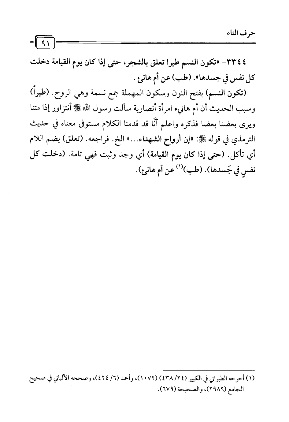 3344 - "تكون النسم طيرا تعلق بالشجر، حتى إذا كان يوم القيامة دخلت كل نفس في جسدها". (طب) عن أم هانئ.