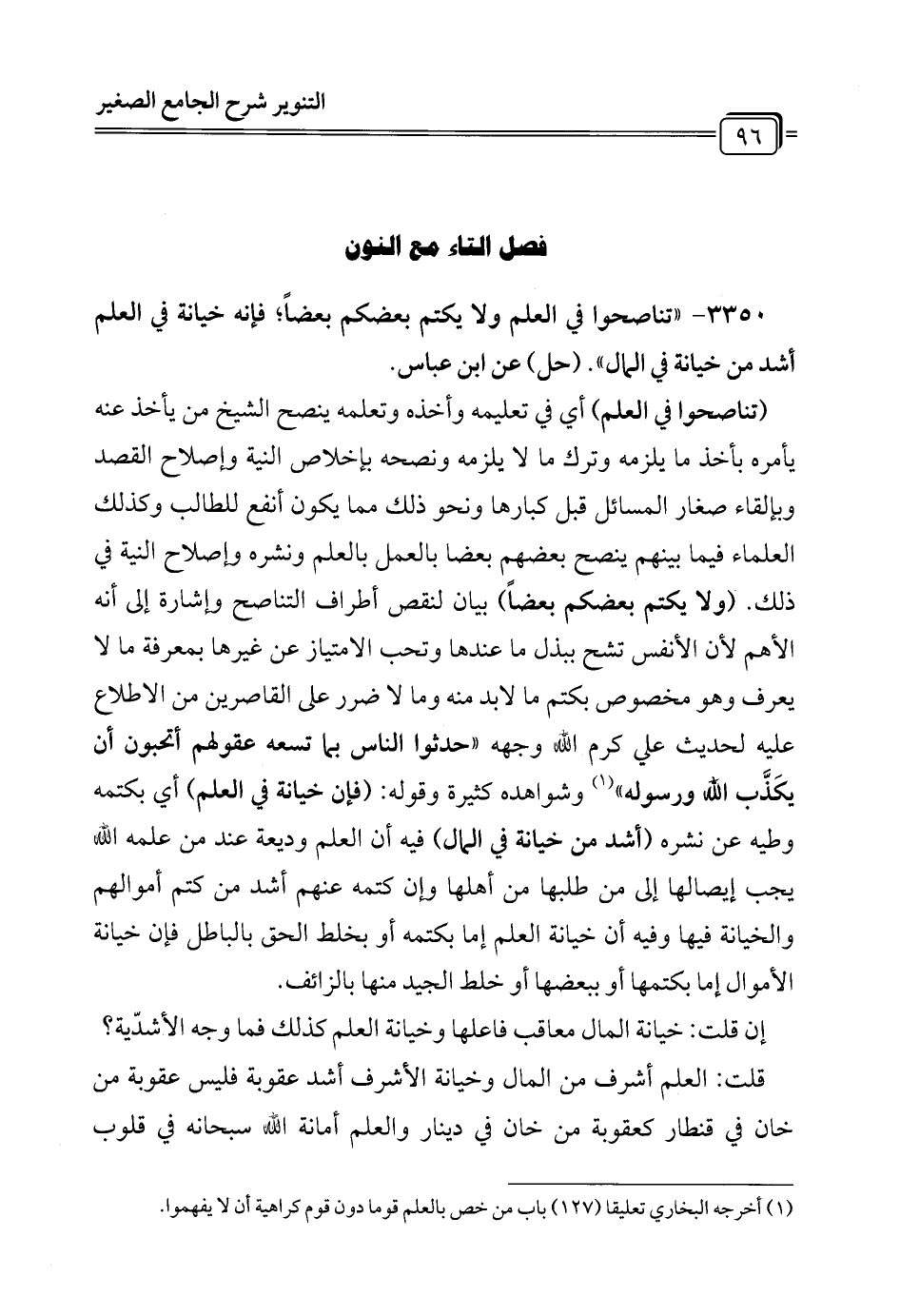 3350 - " تناصحوا في العلم ولا يكتم بعضكم بعضاً، فإنه خيانة في العلم أشد من خيانة في المال". (حل) عن ابن عباس.