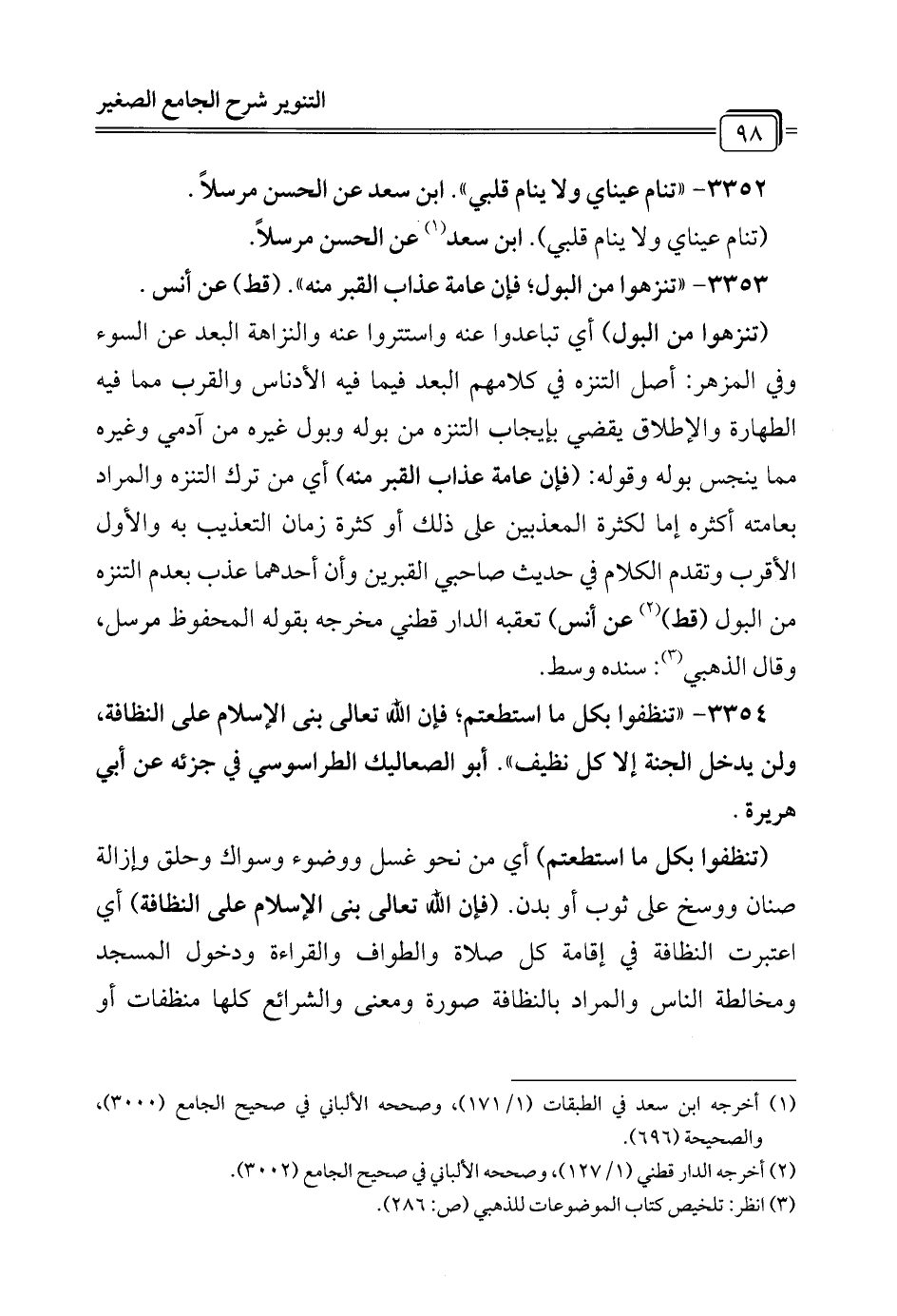 3353 - "تنزهوا من البول؛ فإن عامة عذاب القبر منه". (قط) عن أنس.