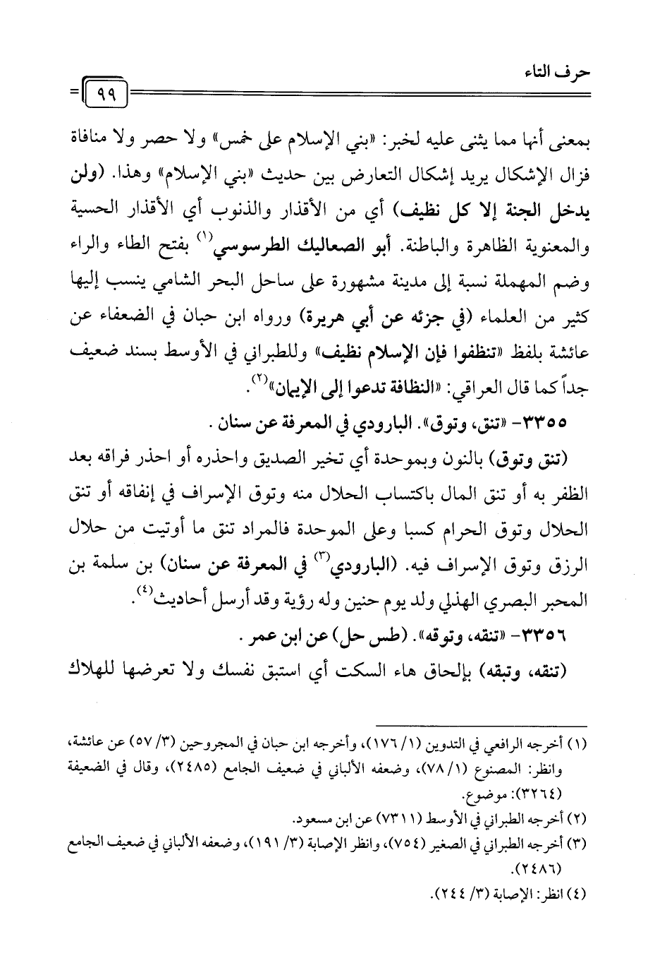 بمعنى أنها مما يثنى عليه لخبر: "بني الإِسلام على خمس" ولا حصر ولا منافاة فزال الإشكال يريد إشكال التعارض بين حديث "بني الإِسلام" وهذا. (ولن يدخل الجنة إلا كل نظيف) أي من الأقذار والذنوب أي الأقذار الحسية والمعنوية الظاهرة والباطنة. أبو الصعاليك الطرسوسي (¬1) بفتح الطاء والراء وضم المهملة نسبة إلى مدينة مشهورة على ساحل البحر الشامي ينسب إليها كثير من العلماء (في جزئه عن أبي هريرة) ورواه ابن حبان في الضعفاء عن عائشة بلفظ "تنظفوا فإن الإِسلام نظيف" وللطبراني في الأوسط بسند ضعيف جداً كما قال العراقي: "النظافة تدعوا إلى الإيمان" (¬2).