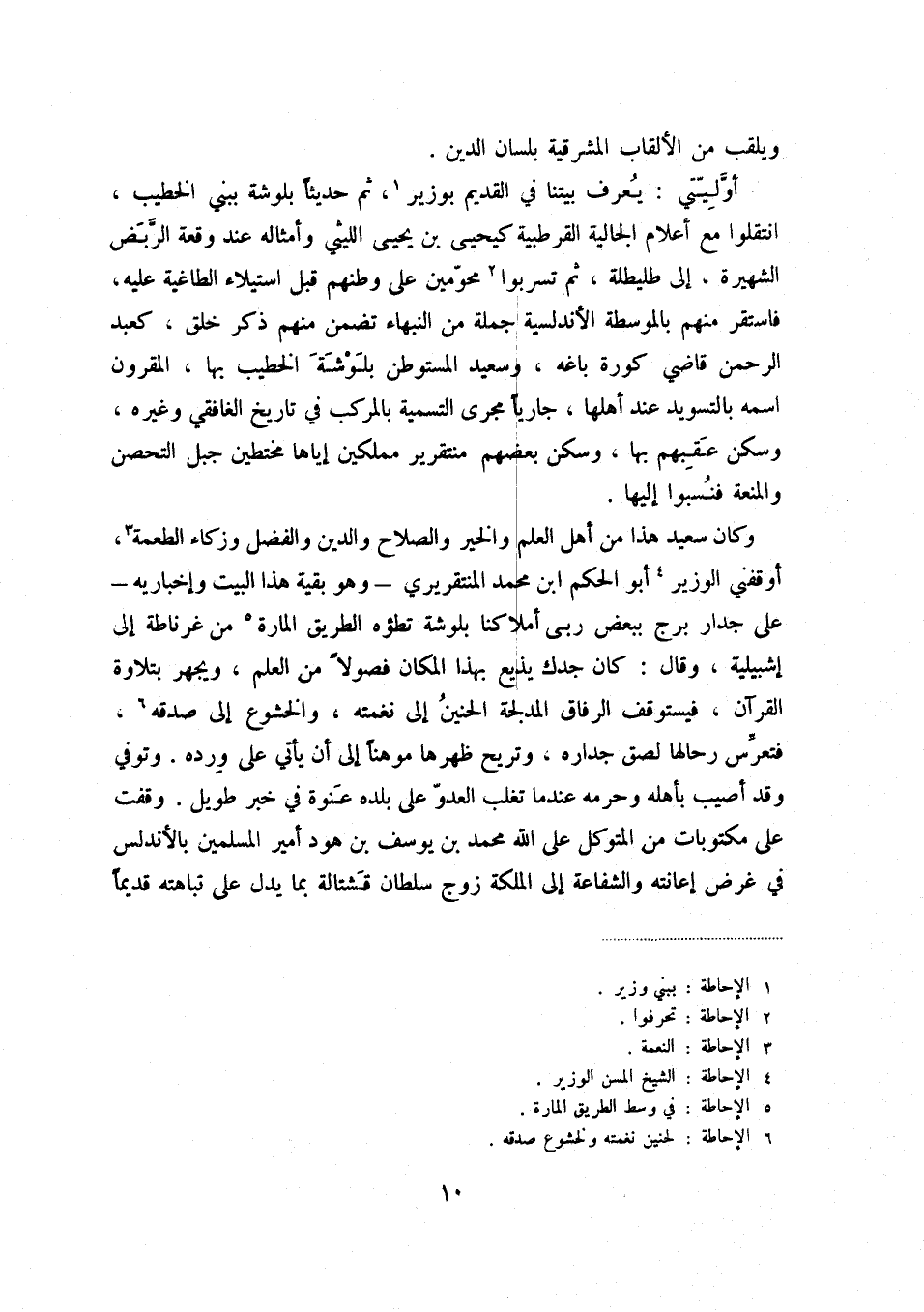 أوليتي: يعرف بيتنا في القديم بوزير (1) ، ثم حديثاً بلوشة ببني الخطيب، انتقلوا مع أعلام الجالية القرطبية كيحيى بن يحيى الليثي وأمثاله عند وقعة الربض الشهيرة، إلى طليطلة، ثم تسربوا (2) محومين على وطنهم قبل استيلاء الطاغية عليه، فاستقر منهم بالموسطة الأندلسية جملة من النبهاء تضمن منهم ذكر خلق، كعبد الرحمن قاضي كورة باغه، وسعيد المستوطن بلوشة الخطيب بها، المقرون اسمه بالتسويد عند أهلها، جارياً مجرى التسمية بالمركب في تاريخ الغافقي وغيره، وسكن عقبهم بها، وسكن بعضهم منتقرير مملكين إياها مختطين جبل التحصن والمنعة فنسبوا إليها.