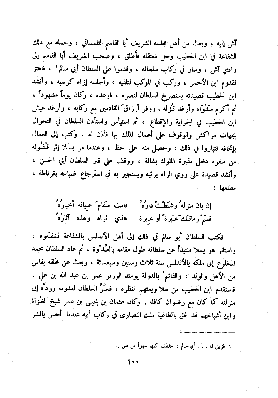 قسم زمانك عبرة أو عبرة ... هذي ثراه وهذه آثاره فكتب السلطان أبو سالم في ذلك إلى أهل الأندلس بالشفاعة فشفعوه، واستقر هو بسلا منتبذاً عن سلطانه طول مقامه بالعدوة، ثم عاد السلطان محمد المخلوع إلى ملكه بالأندلس سنة ثلاث وستين وسبعمائة، وبعث عن مخلفه بفاس من الأهل والولد، والقائم بالدولة يومئذ الوزير عمر بن عبد الله بن علي، فاستقدم ابن الخطيب من سلا وبعثهم لنظره، فسر السلطان لقدومه ورده إلى منزلته كما كان مع رضوان كافله، وكان عثمان بن يحيى بن عمر شيخ الغزاة وابن أشياخهم قد لحق بالطاغية ملك النصارى في ركاب أبيه عندما أحس بالشر